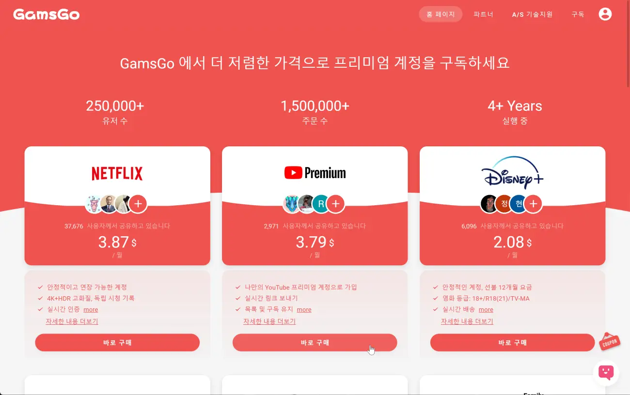 겜스고는 유튜브 프리미엄의 경우 150만 건 이상의 주문이 이루어진 세계 최대 규모의 계정공유 서비스입니다. 넷플릭스나 드지니플러스는 물론이고, 유튜브 프리미엄은 자신의 계정으로 이용이 가능합니다.