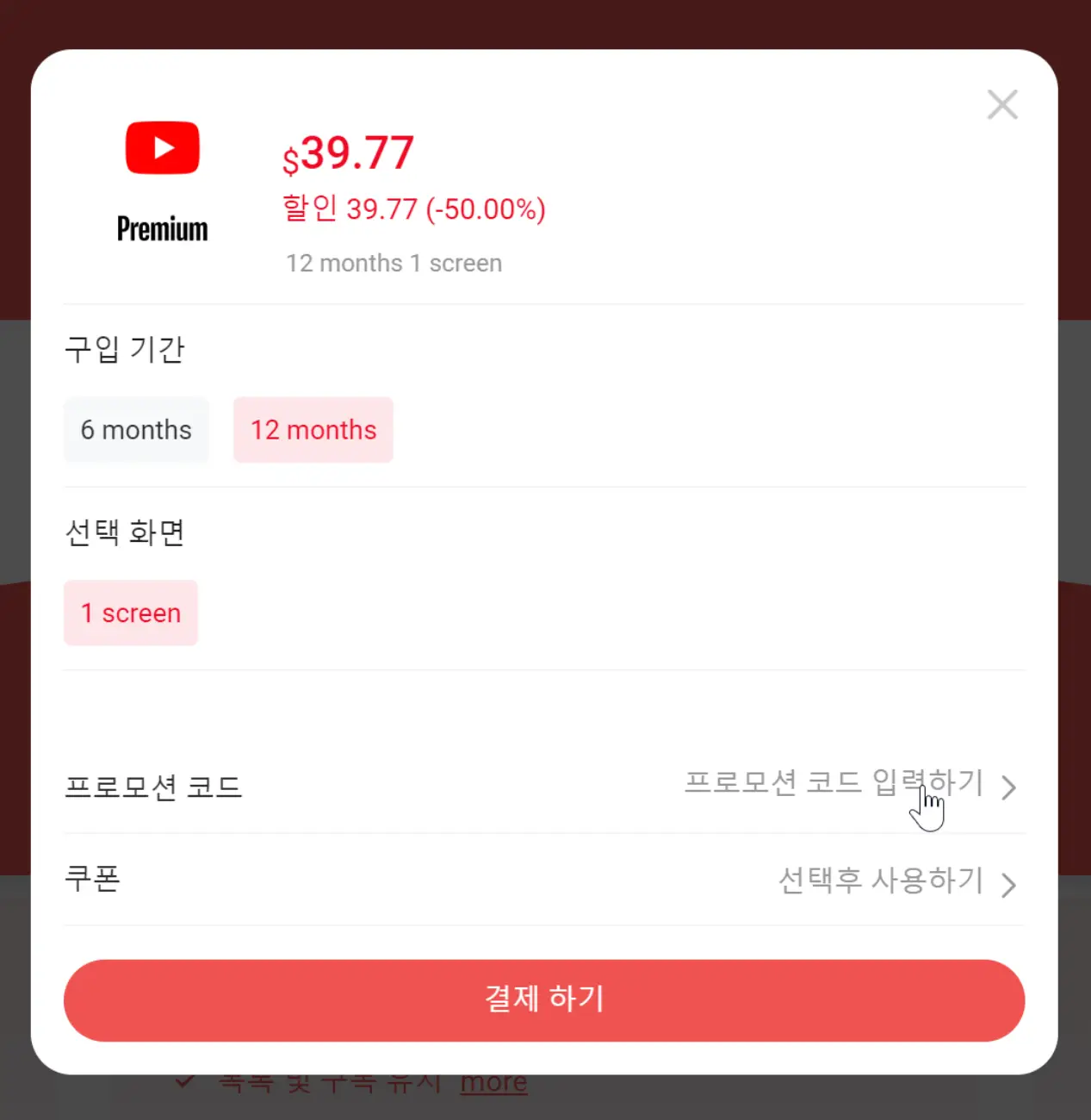 그리고 아래의 프로모션 코드를 입력하면 5% 더 할인이 적용되어 12개월 기준 $39.77(약 5만 2천원) 가격으로 이용할 수 있습니다. 정가 12만 5400원에 비하면 42% 가격에 유튜브 프리미엄을 즐길 수 있습니다. 유튜브 프리미엄 구독료는 매달 세금처럼 지출되는 금액이므로 구독료를 조금이라도 아끼는 것이 좋습니다.