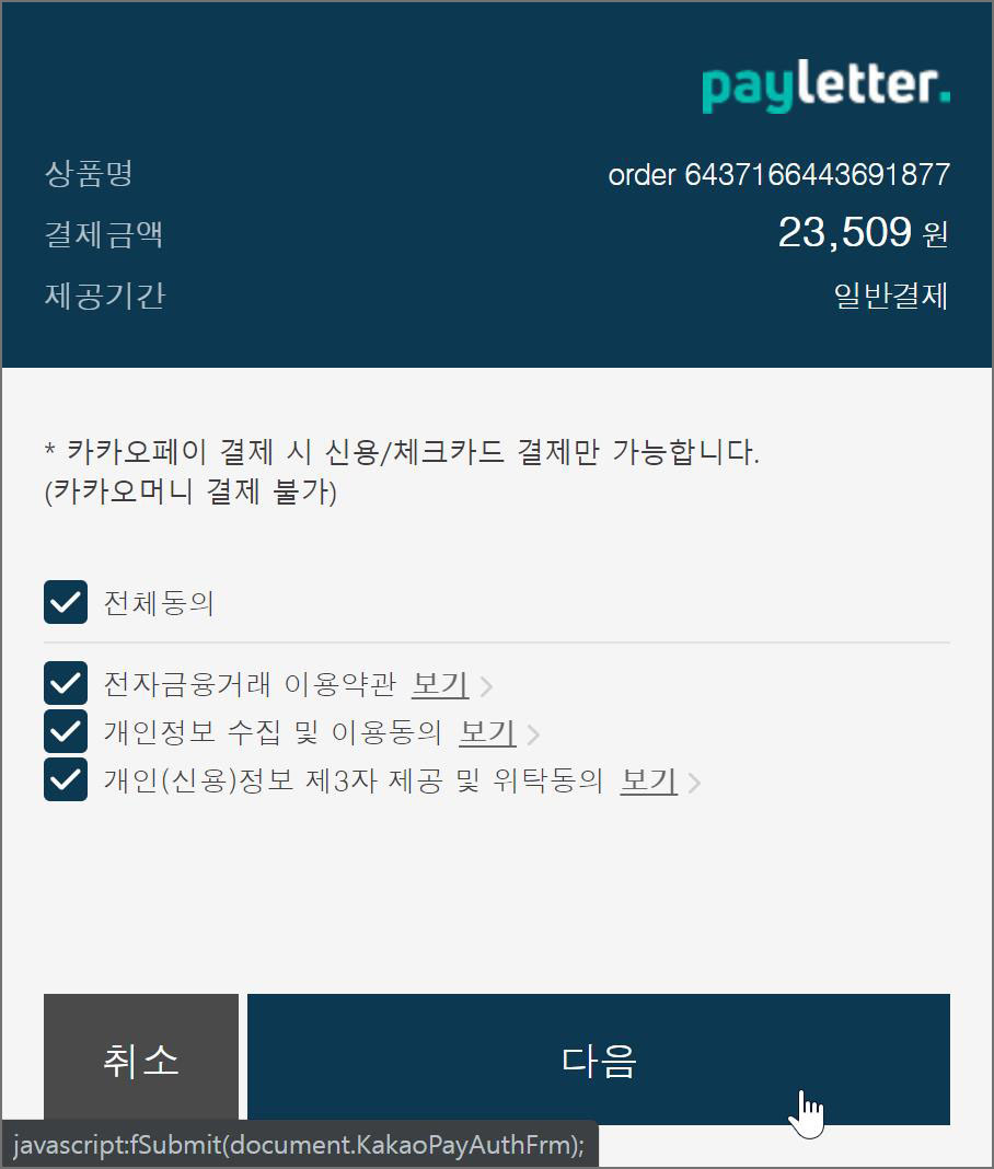 결제는 카카오페이, 신용카드, 계좌이체 등 다양한 방식으로 결제가 가능합니다.