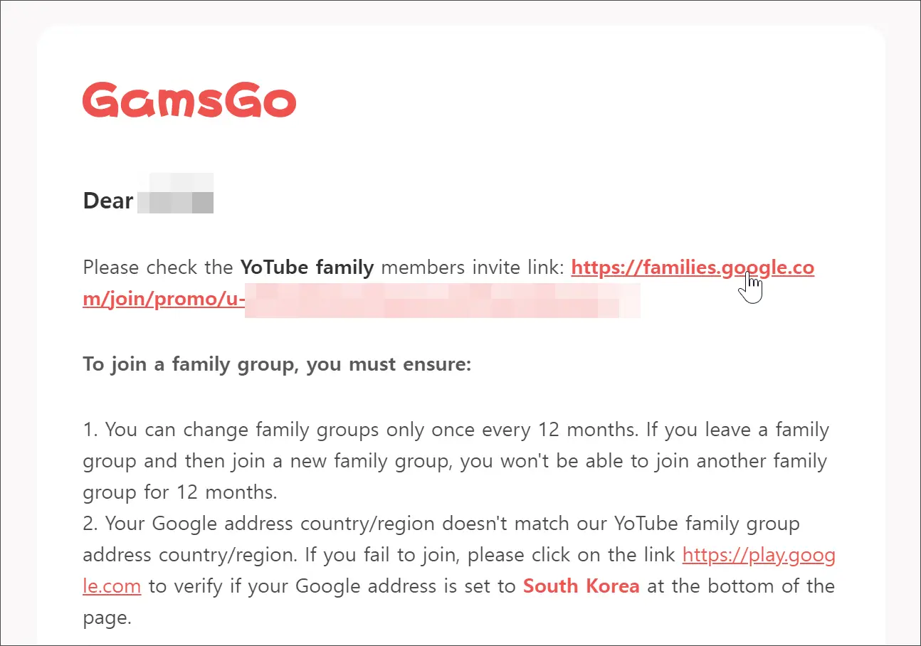 결제를 완료한 후에는 유튜브 프리미엄을 적용할 G메일 계정을 입력하면 이메일로 가족계정 초대 메일이 도착합니다.