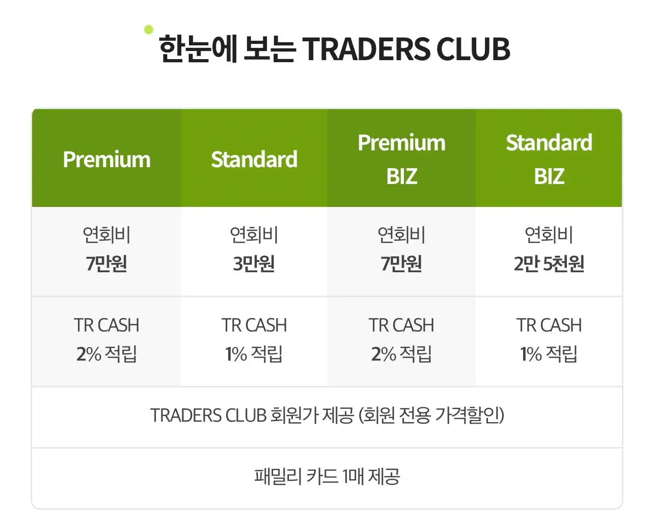 트레이더스 회원제 '트레이더스 클럽'은 크게 프리미엄과 스텐다드로 나뉘며 프리미엄은 연회비 7만원, 스텐다드는 연회비 3만원 입니다. 등급별로 현금처럼 사용이 가능한 TR CASH 2%, 1% 적립이 가능합니다. 사업자 고객을 대상으로 BIZ 멤버십도 동일하지만 스텐다드 비즈 멤버십은 연회비가 2만 5천원 입니다.
