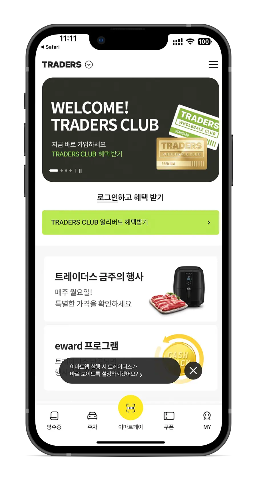 트레이더스 클럽은 이마트앱을 실행하고, 좌측 상단의 이마트 로고를 선택하면 트레이더스 페이지로 전환을 할 수 있습니다.