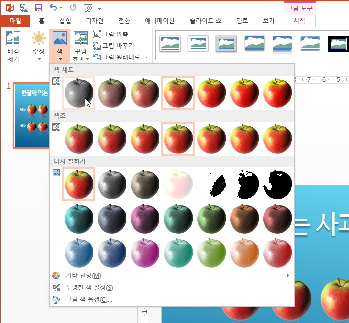 컬러이미지와 회색조 이미지 2장을 준비하는 방법도 있지만 파워포인트 기능을 이용하면 좀더 쉽게 표현할 수 있습니다.