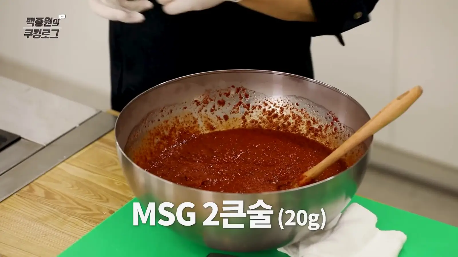 찹쌀 풀의 농도가 잡히면 고춧가루, MSG(미원)를 넣어 섞어줍니다.