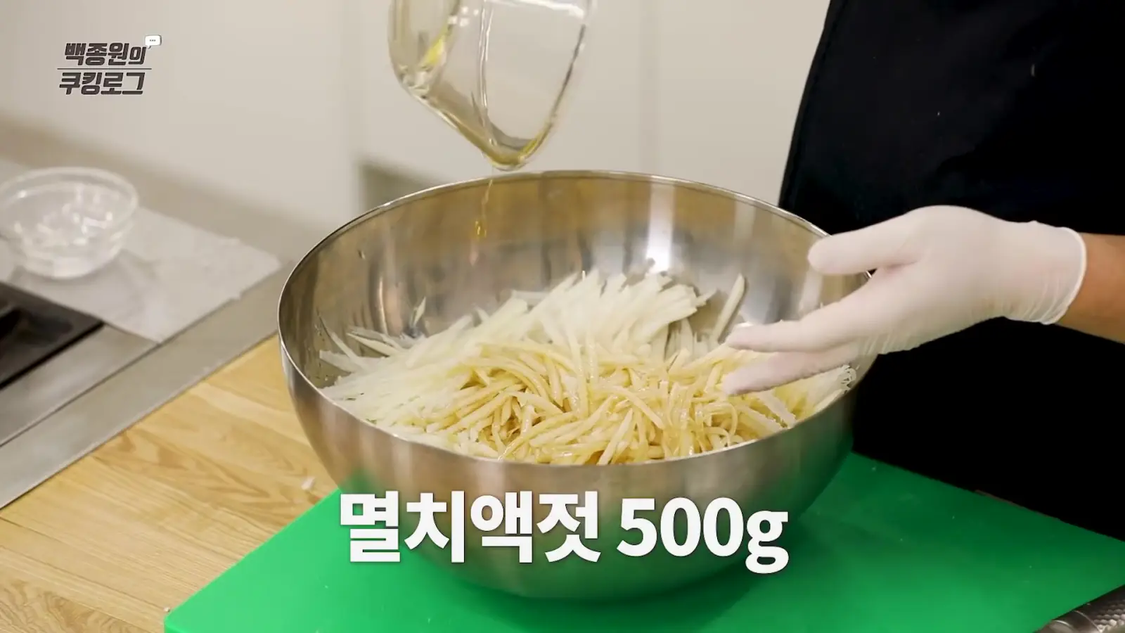 채 썬 무에 꽃소금, 멸치 액젓, 새우젓을 넣어 절여줍니다.