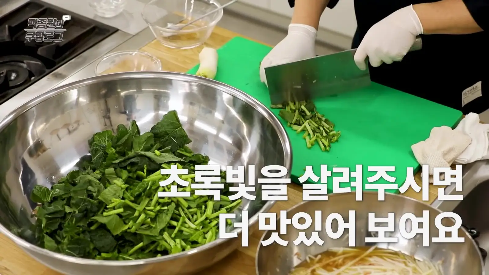 갓은 뿌리를 제거하고 줄기 부분은 3cm, 이파리는 2cm 정도 길이로 자릅니다.