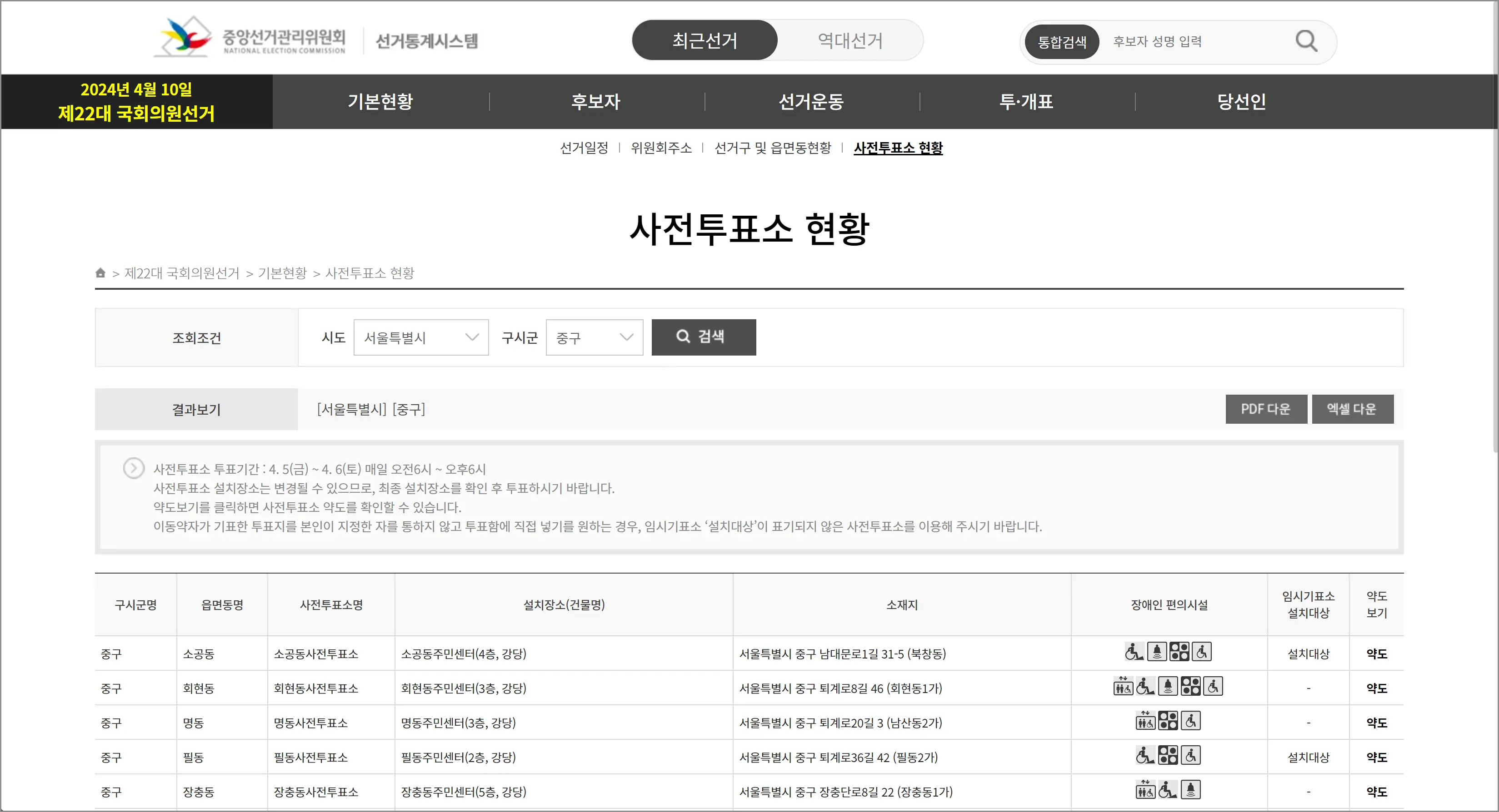 - 중앙선거관리위원회 사전투표소 현황 : 가까운 투표소 확인 가능