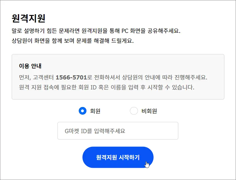 말로 설명하기 어려운 문제가 발생했다면 화면을 공유하면서 상담을 받을 수 있는 원격지원 상담 서비스를 이용할 수 있습니다. 1566-5701 번으로 전화 후 상담원의 안내에 따라 진행할 수 있습니다.