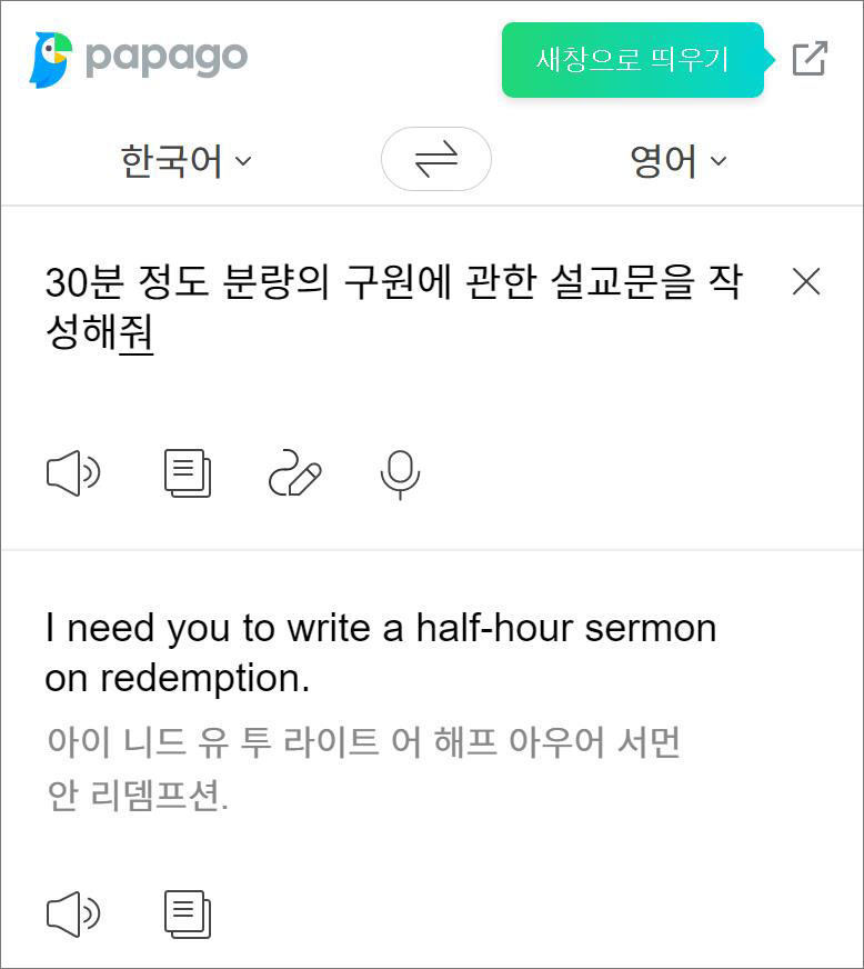 번역된 'I need you to write a half-hour sermon on redemption.' 라는 문장을 챗 GPT에 복사-붙여넣기를 했습니다.
