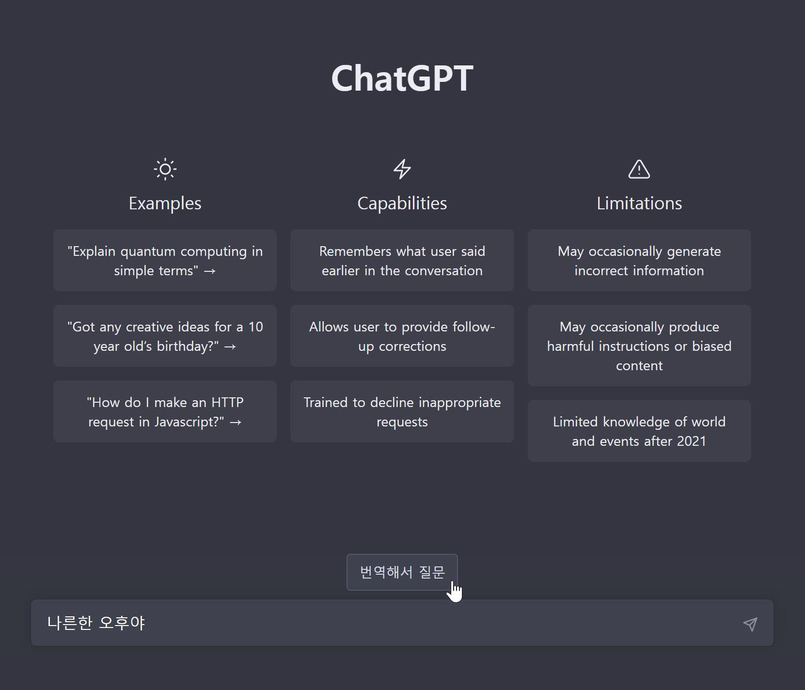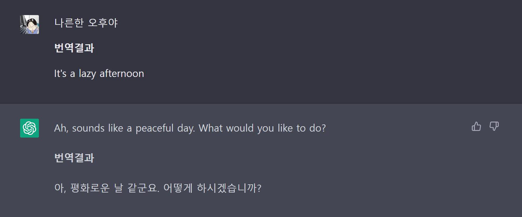ChatGPT 쓸 때 질문을 영어로 번역해 주고, 답변도 한글로 번역해 주는 번역기입니다.