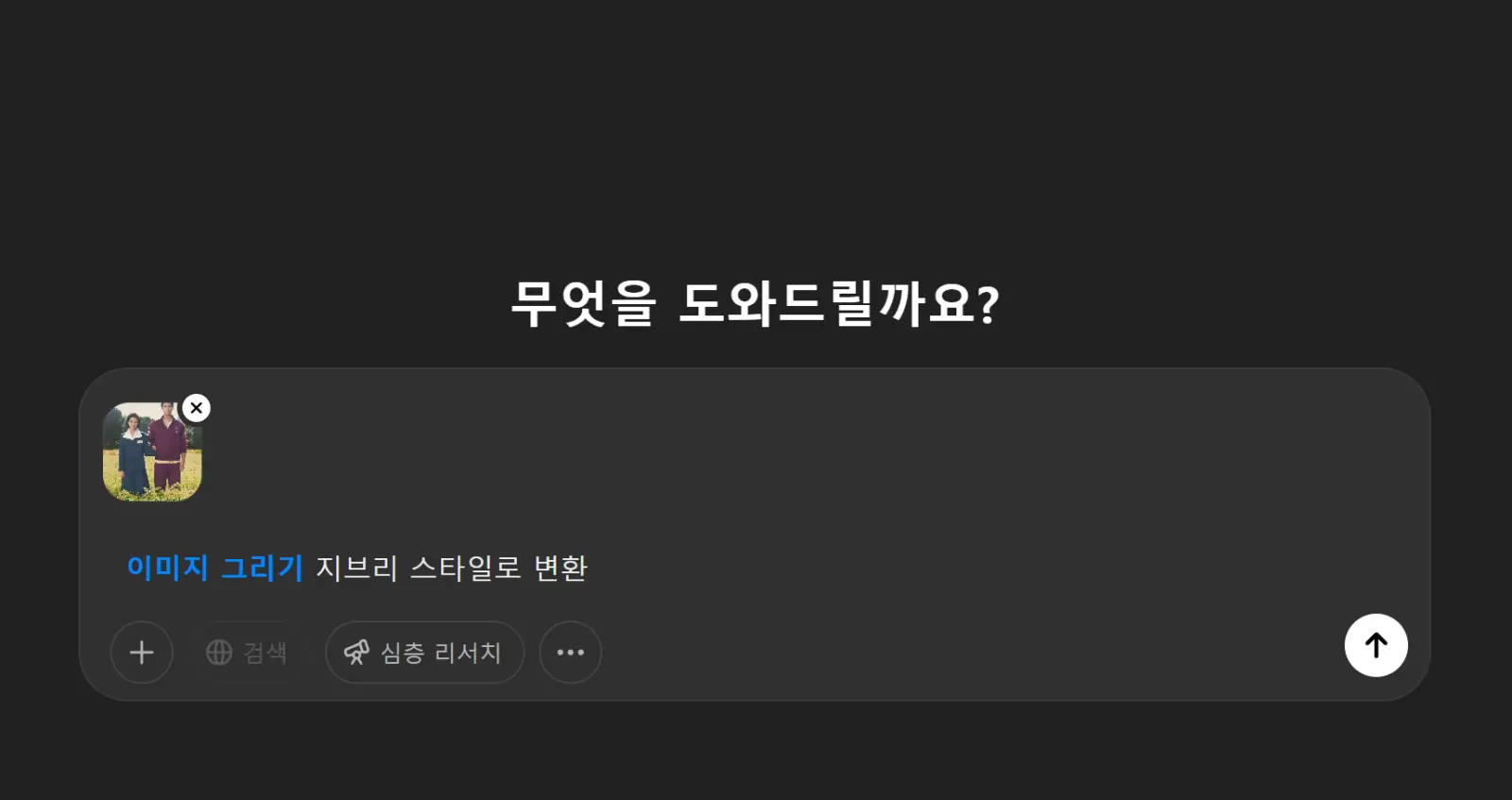 먼저 챗GPT에 접속하여 '+' 버튼을 눌러 변환하고자 하는 사진을 업로드합니다.