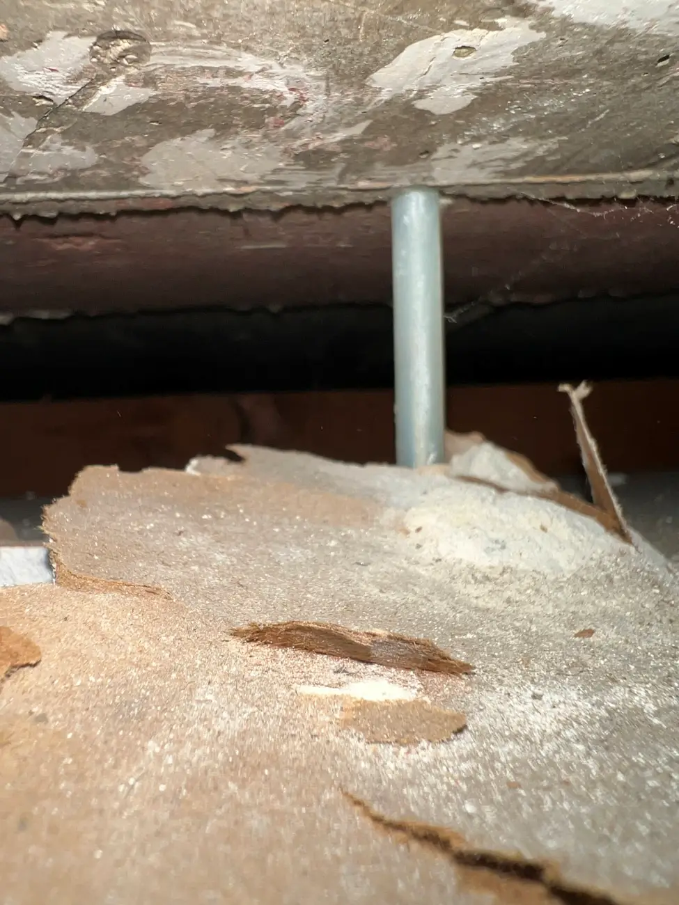 천정을 뜯어 보니 얇은 석고보드 뿐이었습니다. 그 안쪽 천장에는 콘크리트가 있는데, 석고보드와 약 10cm가량 공간이 비어 있었습니다.