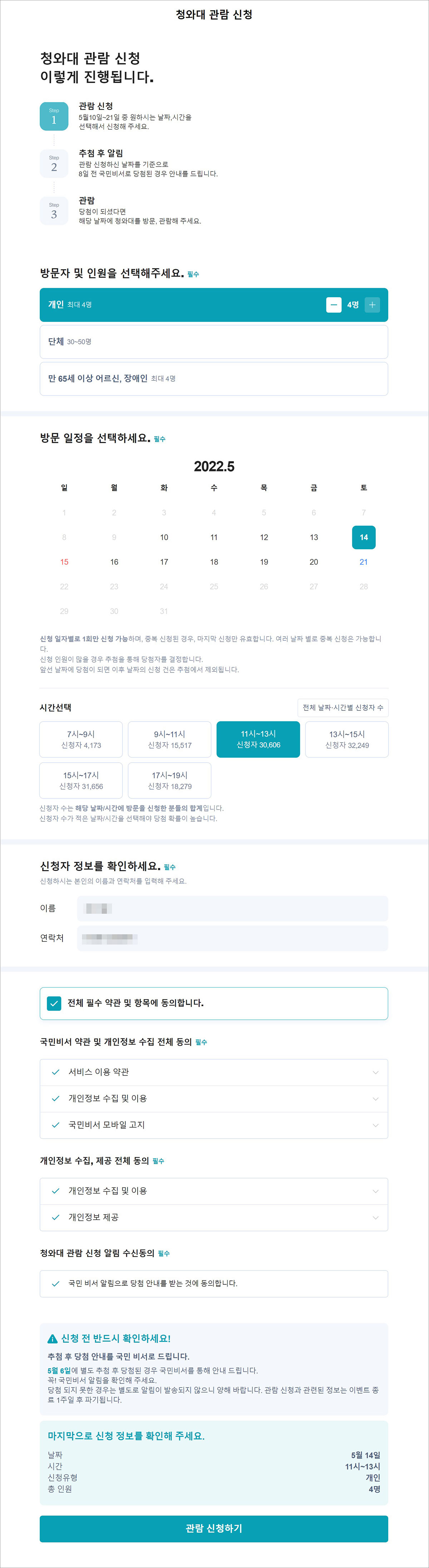 관람을 희망하는 날짜와 인원, 관람 희망 시간 등을 선택하고, 이름과 연락처를 입력하면 당첨되었을 경우 QR코드를 통해 입장이 가능하다고 합니다.