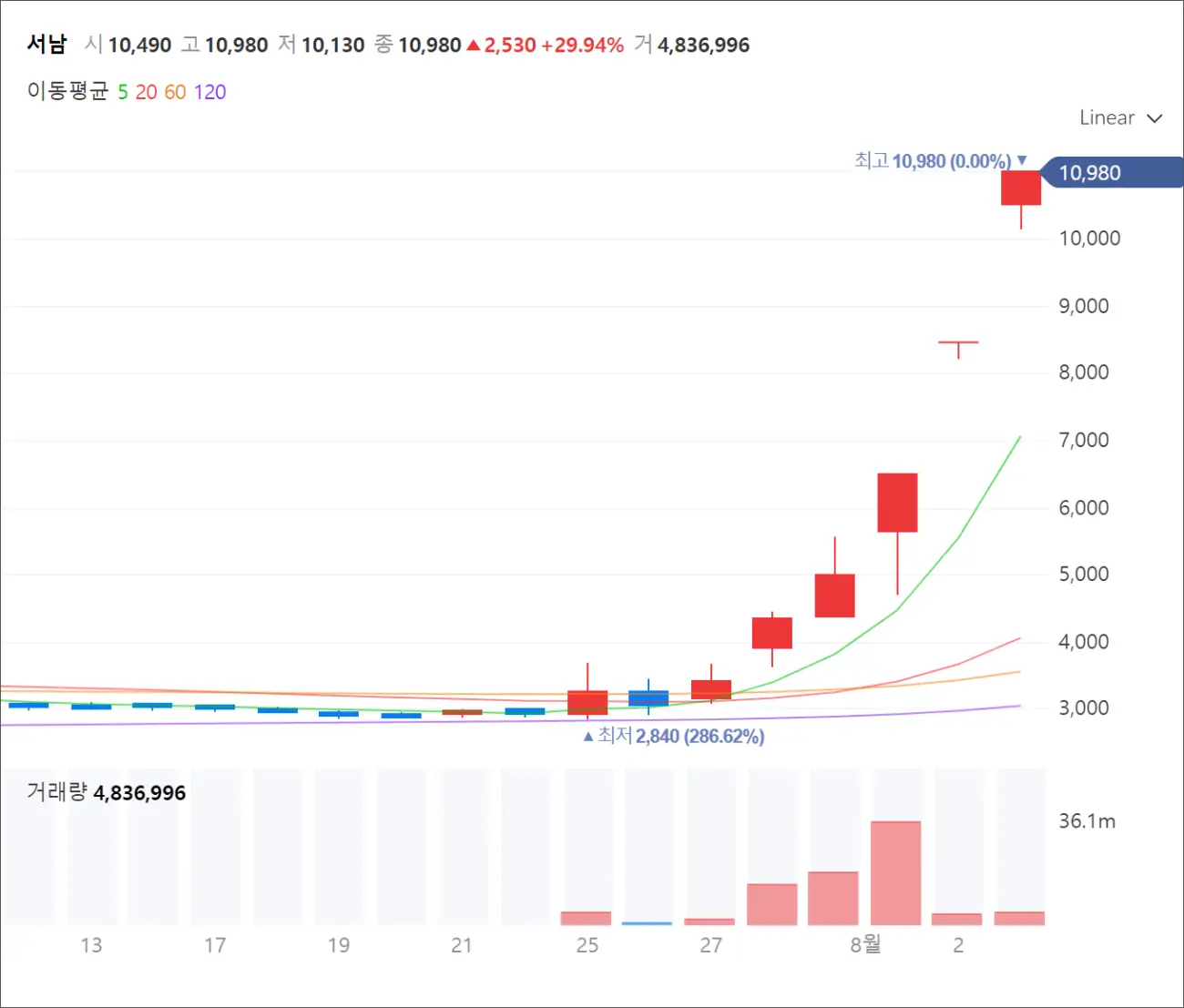 서남은 초전도 선재기술 개발 전문업체로 초전도선, 나노, 파워써플라이, DC전원공급장치, 저온기기 등 초전도체에 직접적으로 관련 있는 회사로 LK-99의 발표로 인해 연일 상한가를 갱신하고 있습니다.