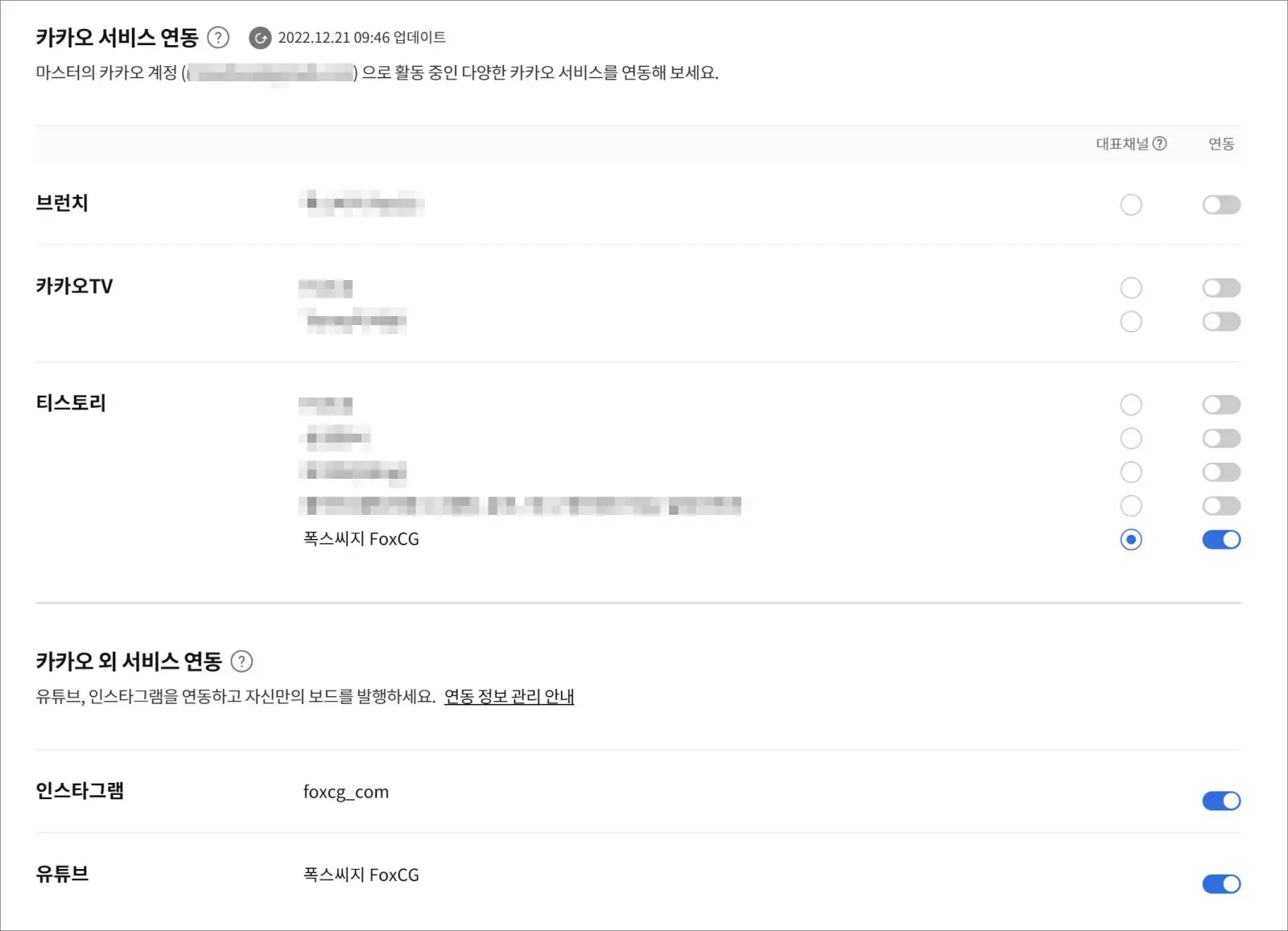 '카카오 뷰 창작센터' 화면에서 설정 안에 '창작채널 관리'를 선택하면 큐레이션 할 본인의 카카오 서비스를 연결할 수 있습니다.