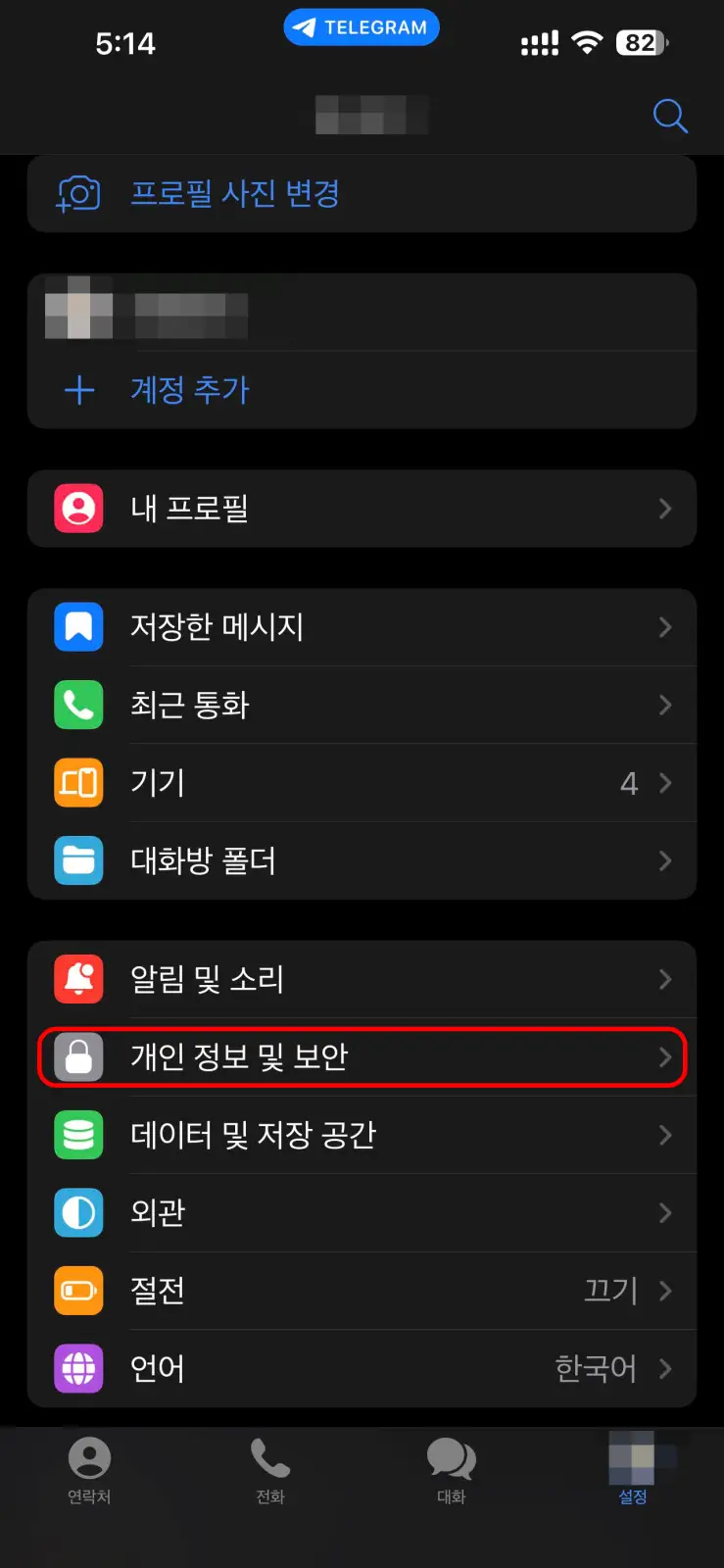 스마트폰에서 텔레그램 앱을 실행하고, 화면 아래에 있는 '설정 버튼'(프로필 이미지)을 터치합니다. - STEP 02: 개인 정보 및 보안(Privacy and Security) 선택