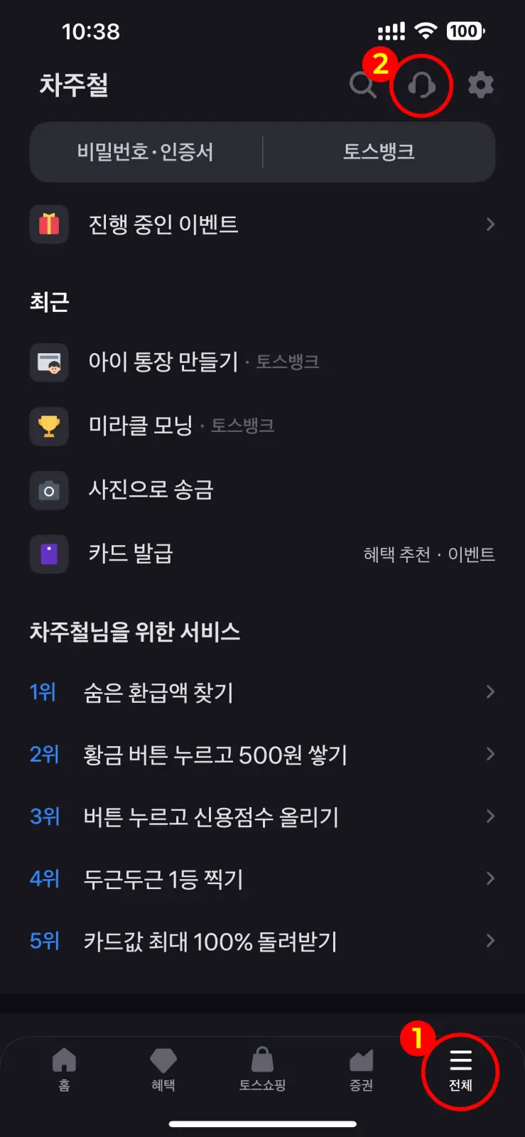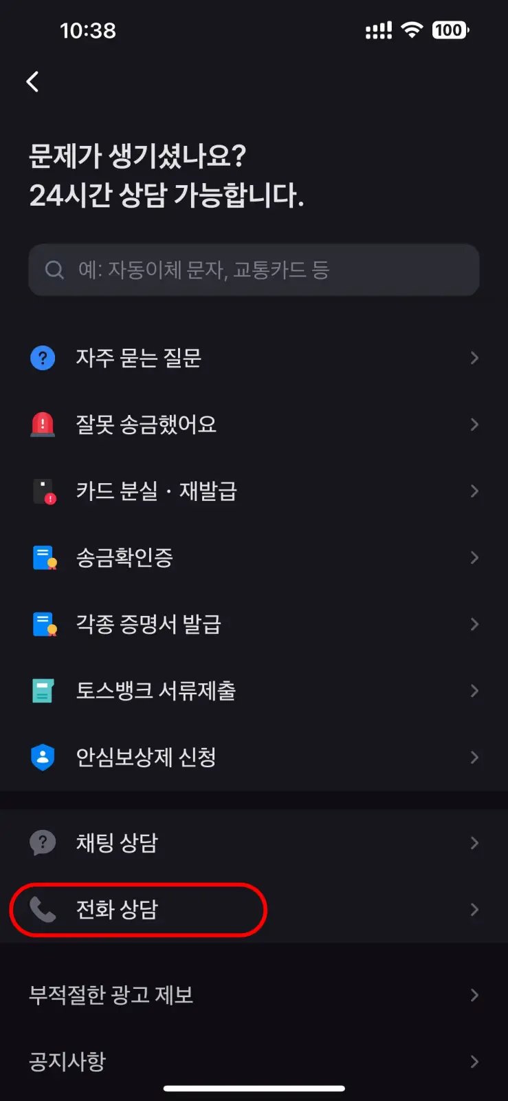 - 토스 앱에 로그인 후 전체메뉴 > 고객센터 > 전화상담을 선택하세요.