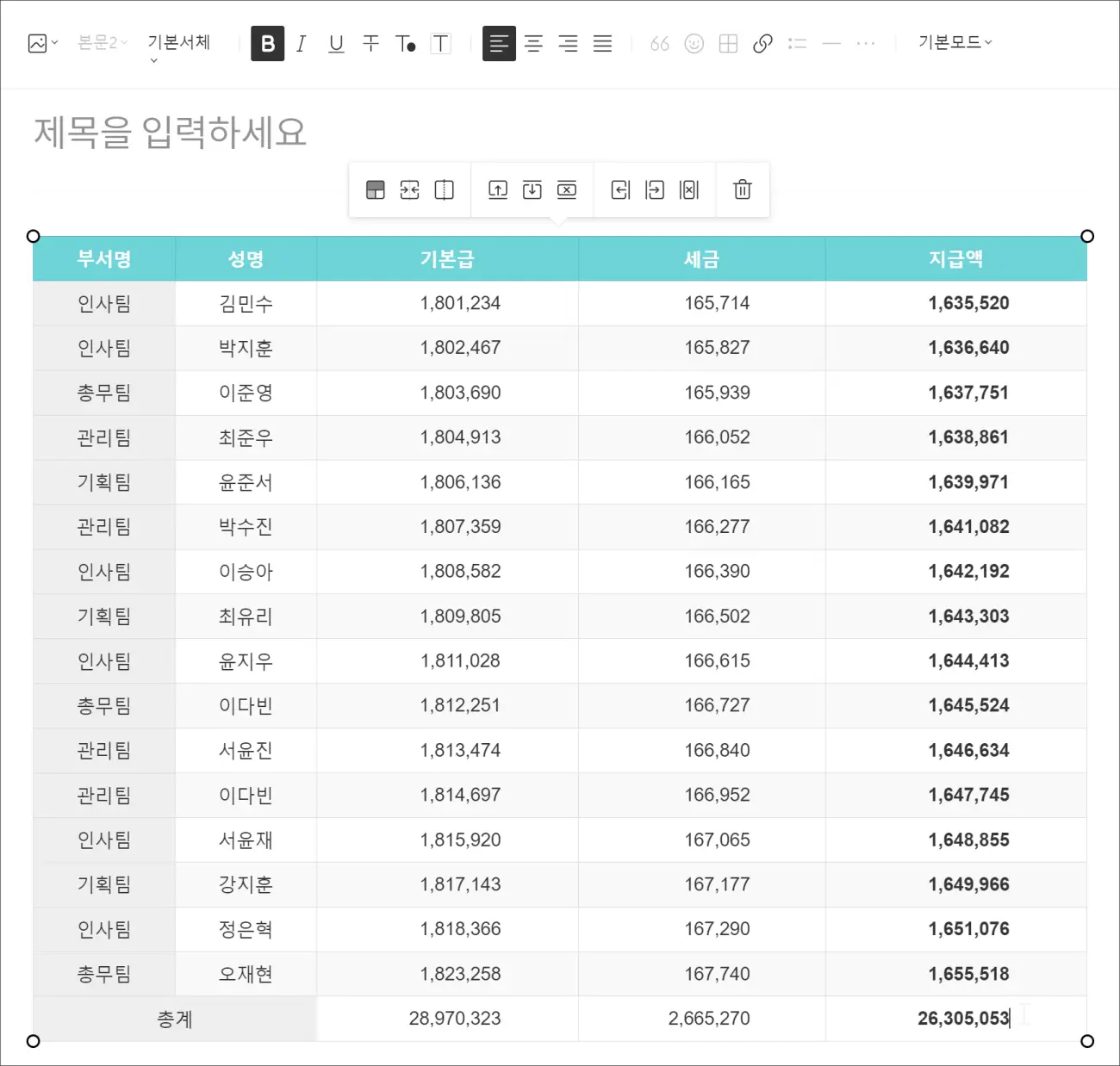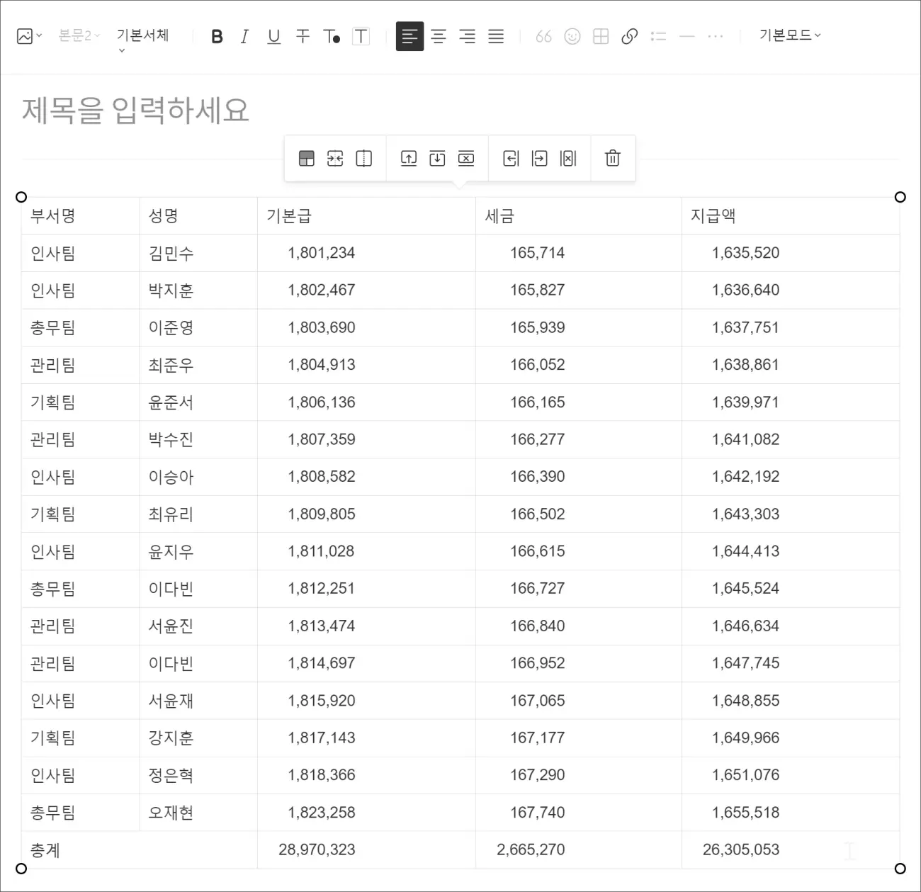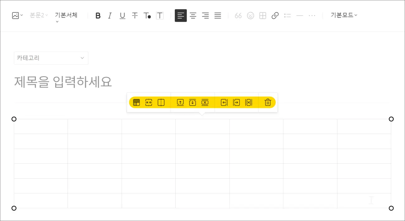 - 표를 선택하면 템플릿, 셀 합치기, 셀 나누기, 상단에 행 삽입, 하단에 행 삽입, 행 삭제, 좌측에 열 삽입, 우측에 열 삽입, 열 삭제, 표 지우기 등의 아이콘으로 세부적인 표 편집이 가능합니다.