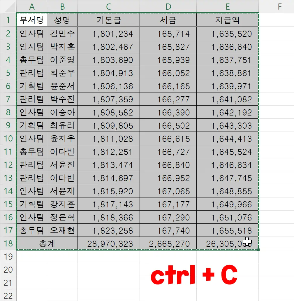 - 가져오기 원하는 영역을 선택하고, Ctrl + C 단축키를 눌러 클립보드로 복사합니다.