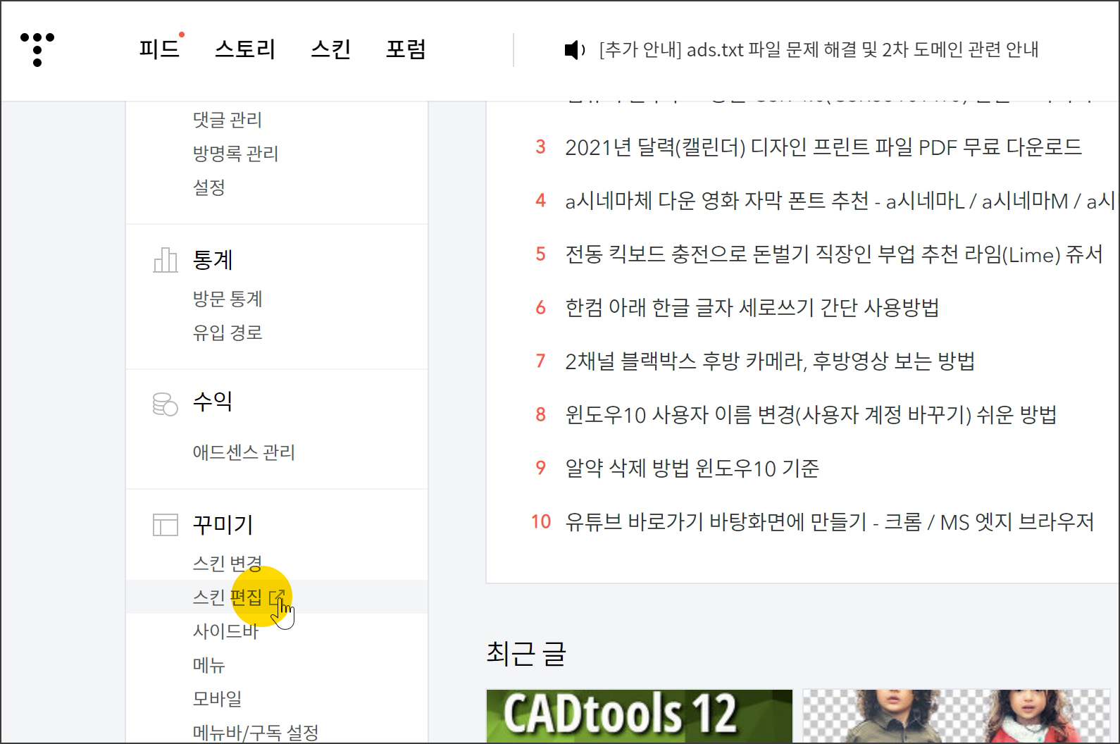 티스토리 관리자 화면에서 '꾸미기'로 이동하여 '스킨 편집'을 선택합니다.