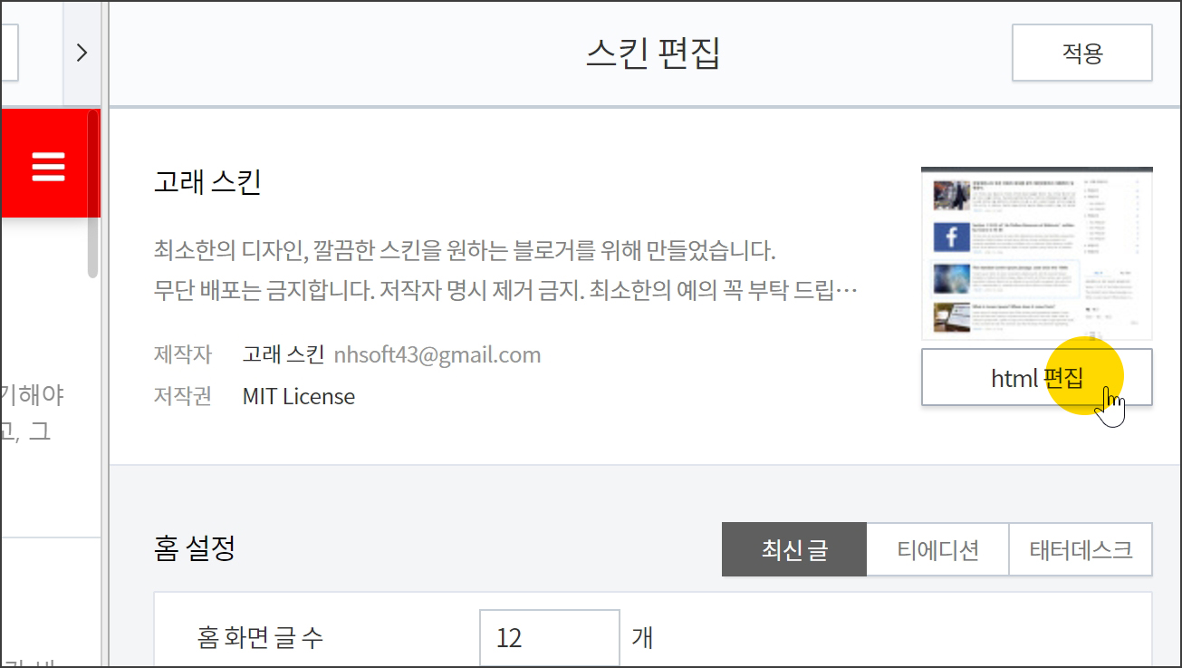 '스킨 편집'으로 이동하면 'html 편집' 버튼을 선택하여 스킨의 html 소스를 수정하는 창으로 이동합니다.