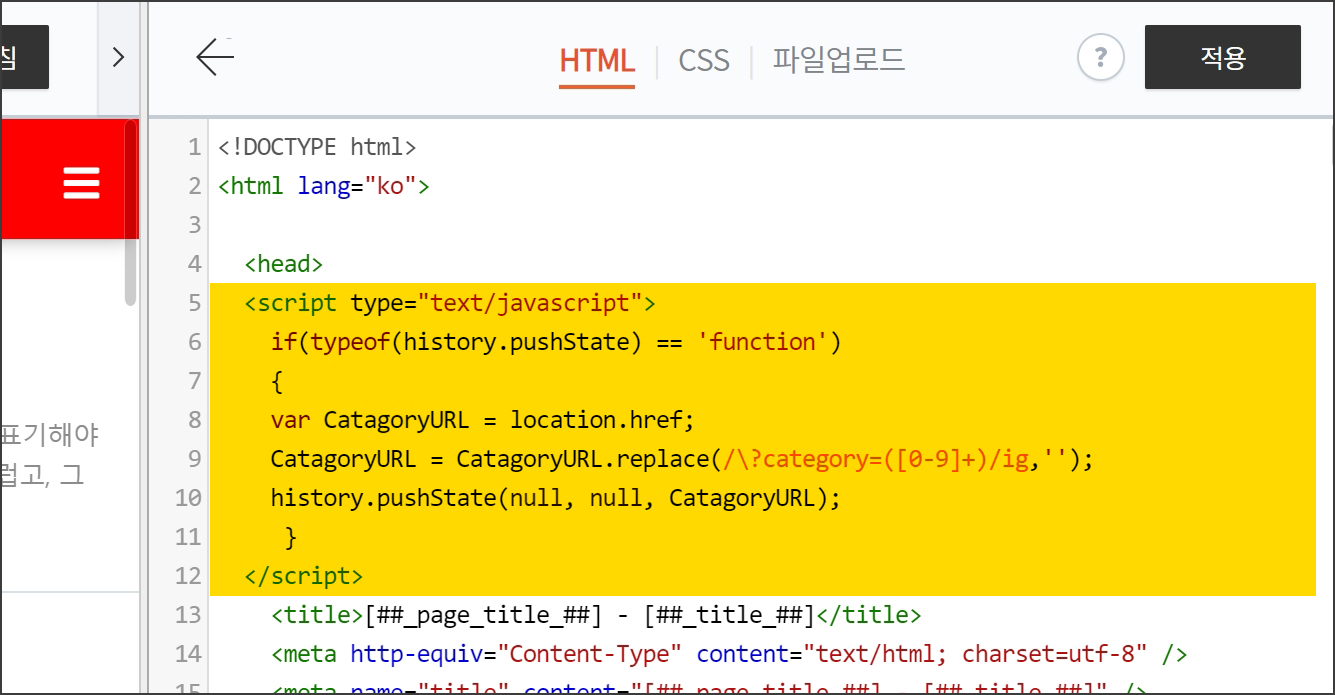 html 소스의 4번째 줄 <head> 아랫줄에 복사한 javascript 를 붙여 넣기 합니다.