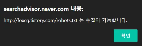 위와 같이 팝업창이 뜨면 정상적으로 robots.txt 파일이 수집되고 있는 것입니다.