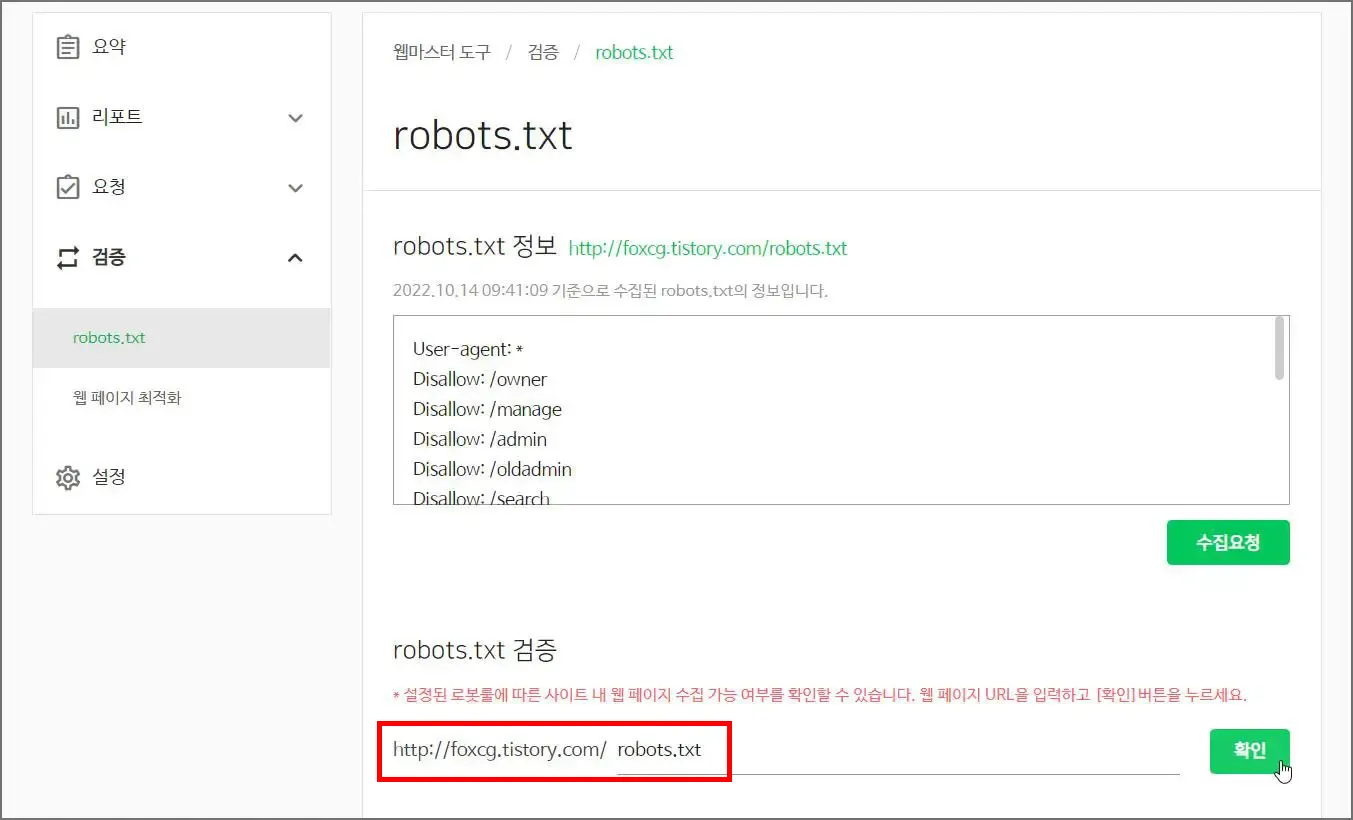 위와 같이 robots.txt 검증 항목에서 자신의 티스토리 주소 뒤에 'robots.txt'를 적고 확인 버튼을 누릅니다.