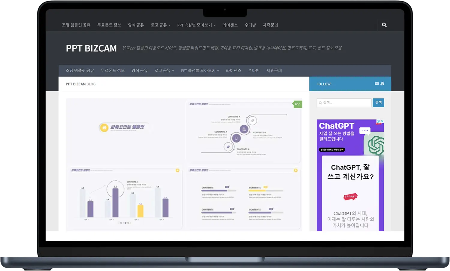 '조땡'이라는 블로거가 PPT 템플릿을 공유하는 별도의 홈페이지를 만들었습니다. PPT 제작에 필요한 무료폰트, 로고, 다양한 애니메이션 효과등을 제공하고 있습니다.