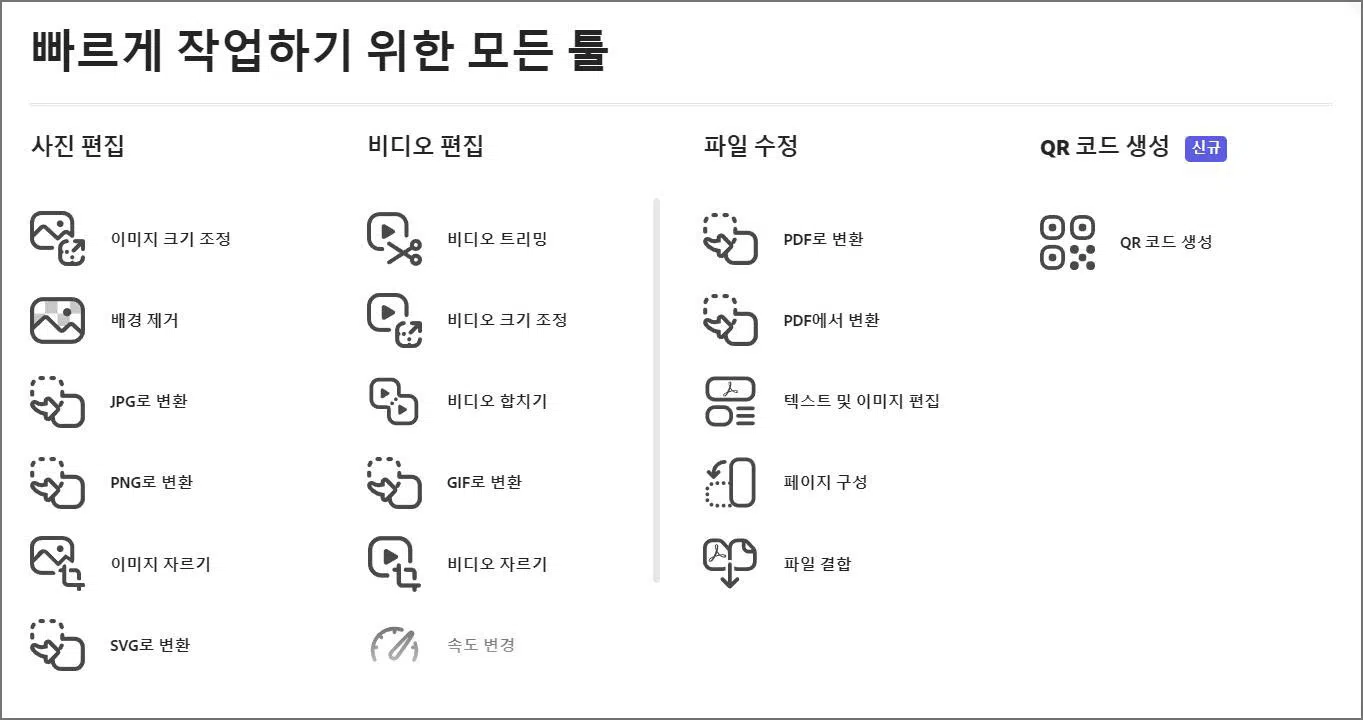 사진 편집 기능으로는 이미지 크기 조정, AI를 이용한 배경제거 기능, 이미지 자르기, 각종 포맷으로 파일 변환하기 등의 기능을 제공합니다.