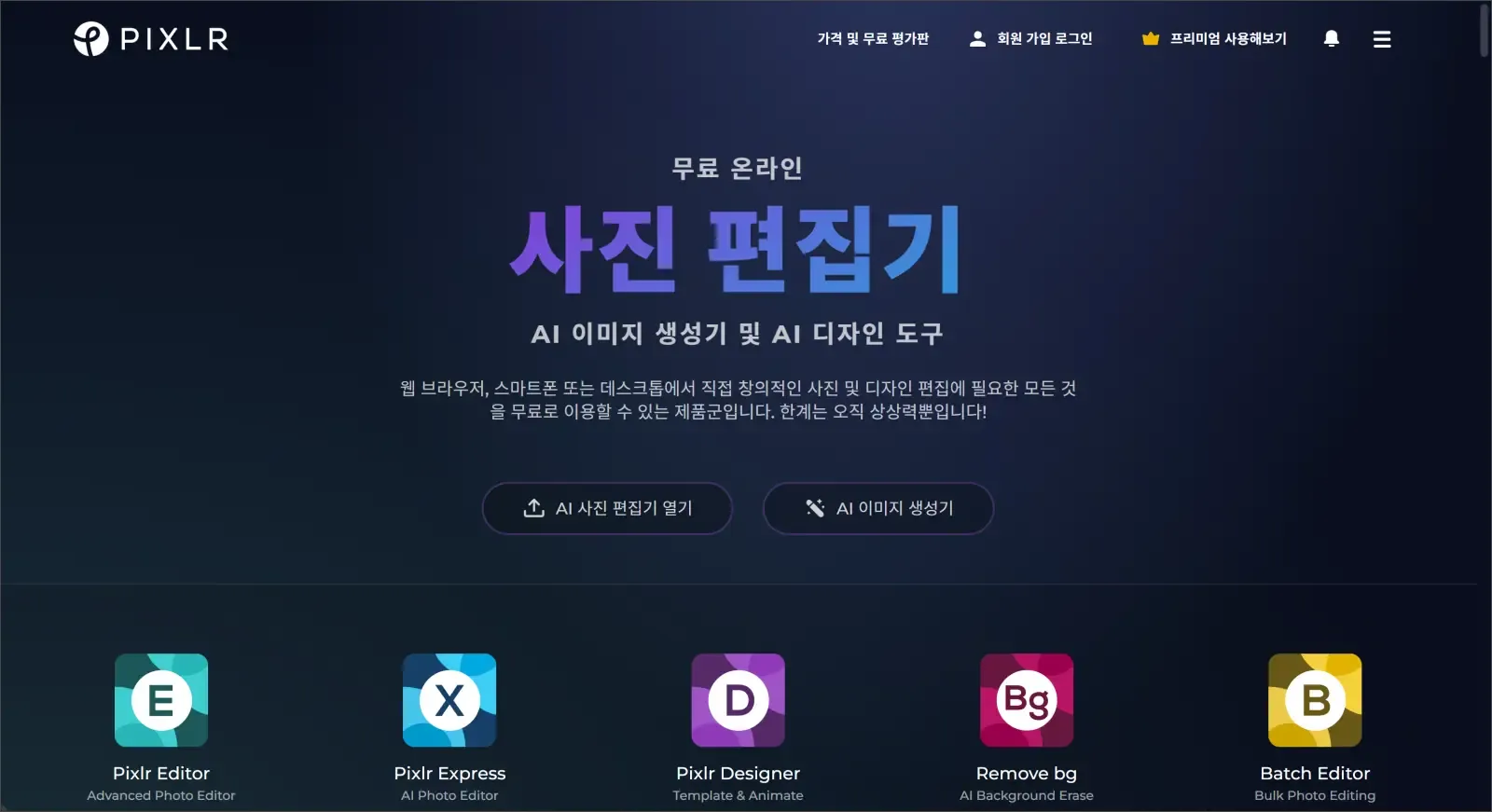 Pixlr | AI 기반 편집, 웹 기반 사용 | 일부 고급 기능은 유료 |