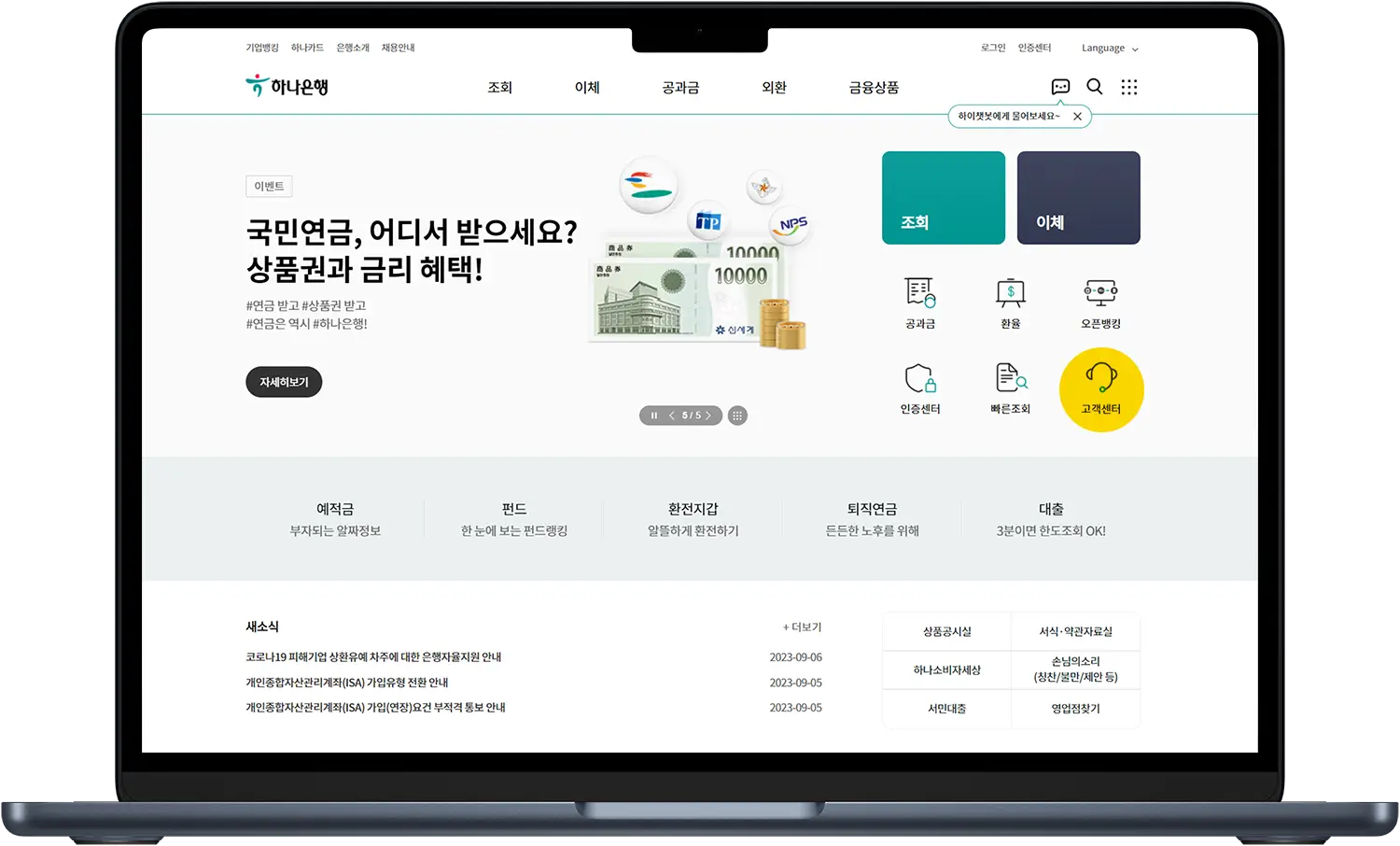 하나은행 홈페이지에 접속하신 후, 우측 상단의 고객센터 메뉴를 클릭합니다.