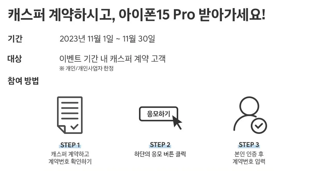 계약 인증 이벤트로 응모자 중 추첨하여 아이폰 15 Pro 3대, 삼성 i5 15인치 노트북 5대, 삼성 갤럭시탭 S9 10대 를 지급하는 이벤트를 진행