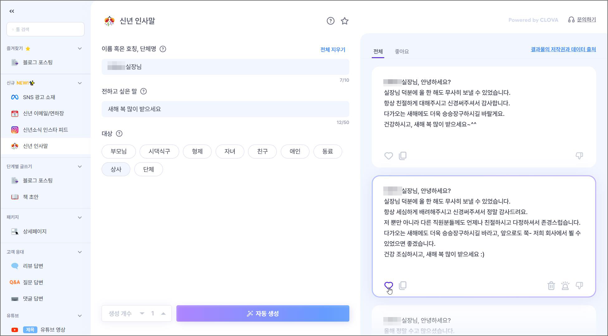 대상과의 관계를 선택한 후 하단의 '자동생성'을 선택하면 새해인사문구가 자동 생성 됩니다.