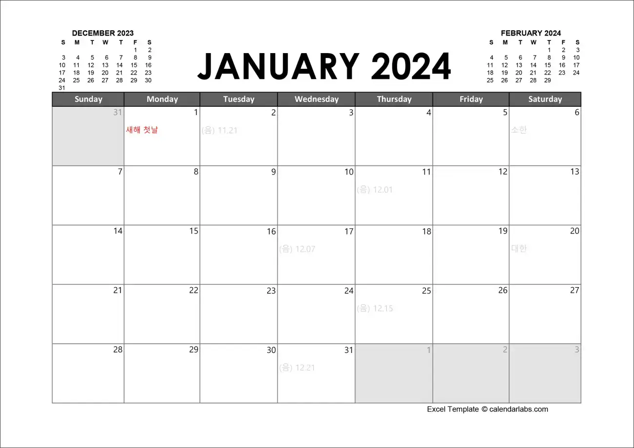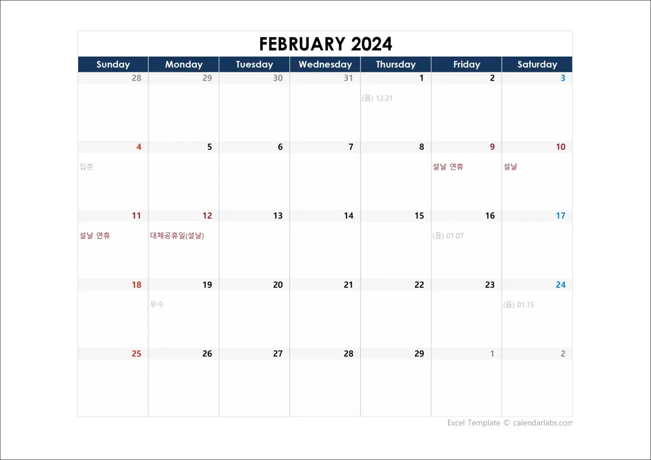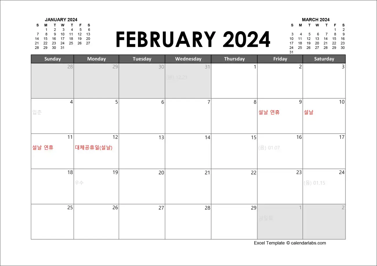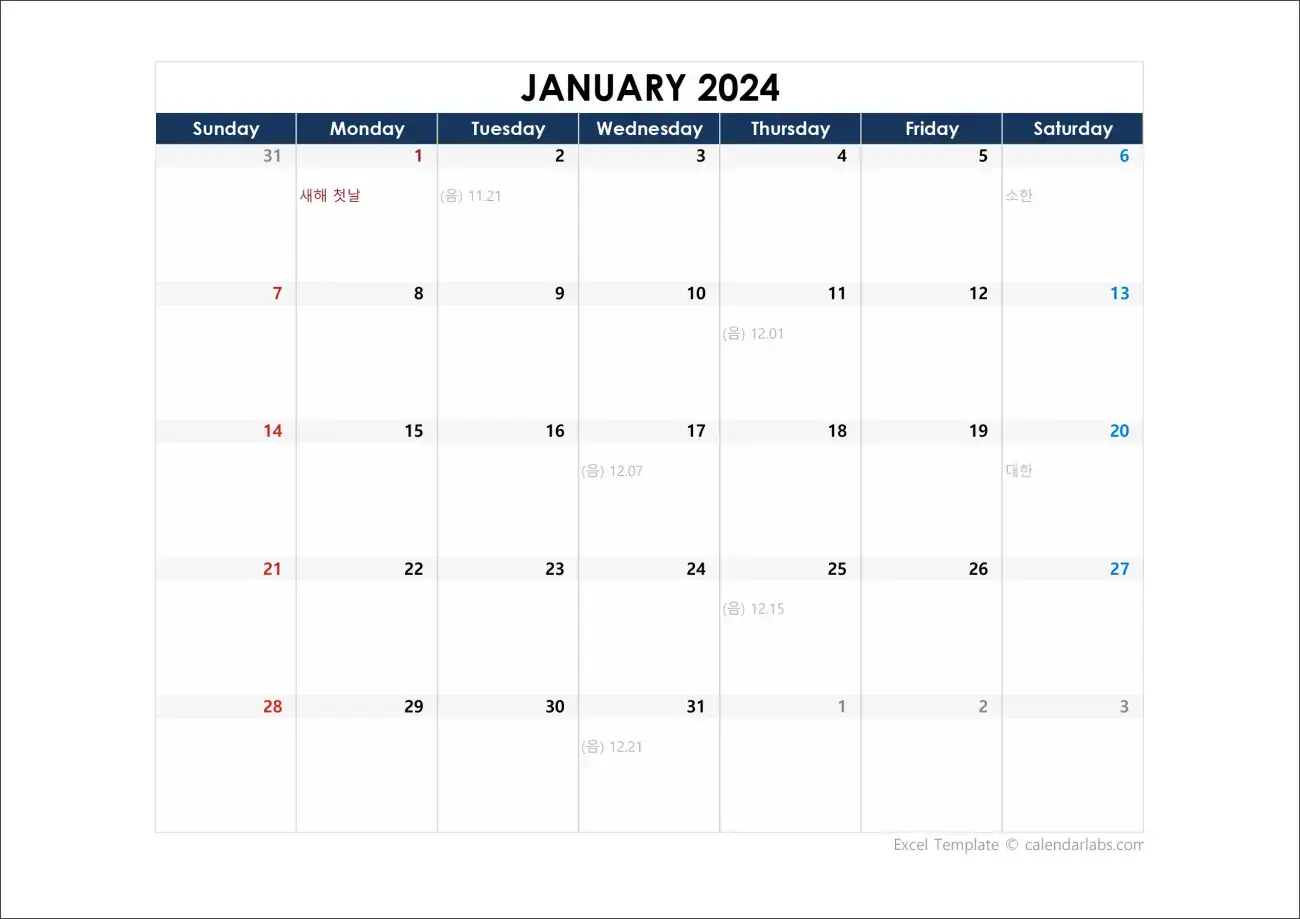원본은 calendarlabs.com 에서 제공받은 파일로 우리나라의 절기와 공휴일을 넣어 수정하였습니다.