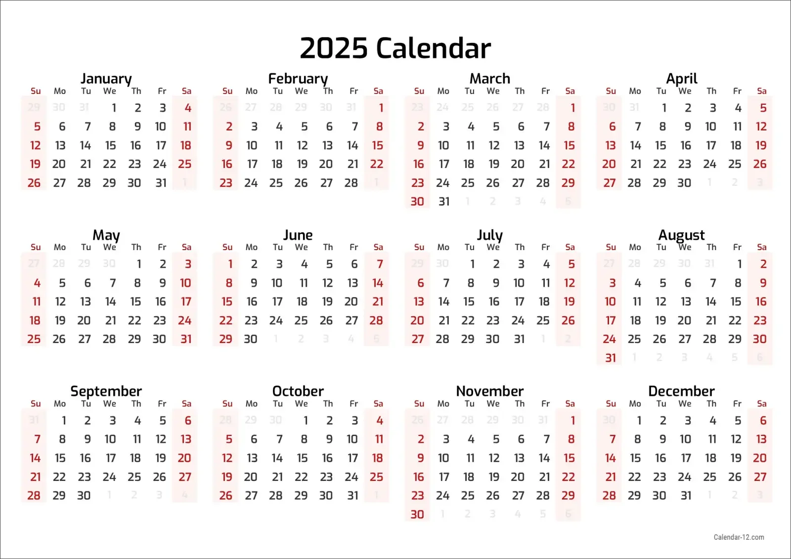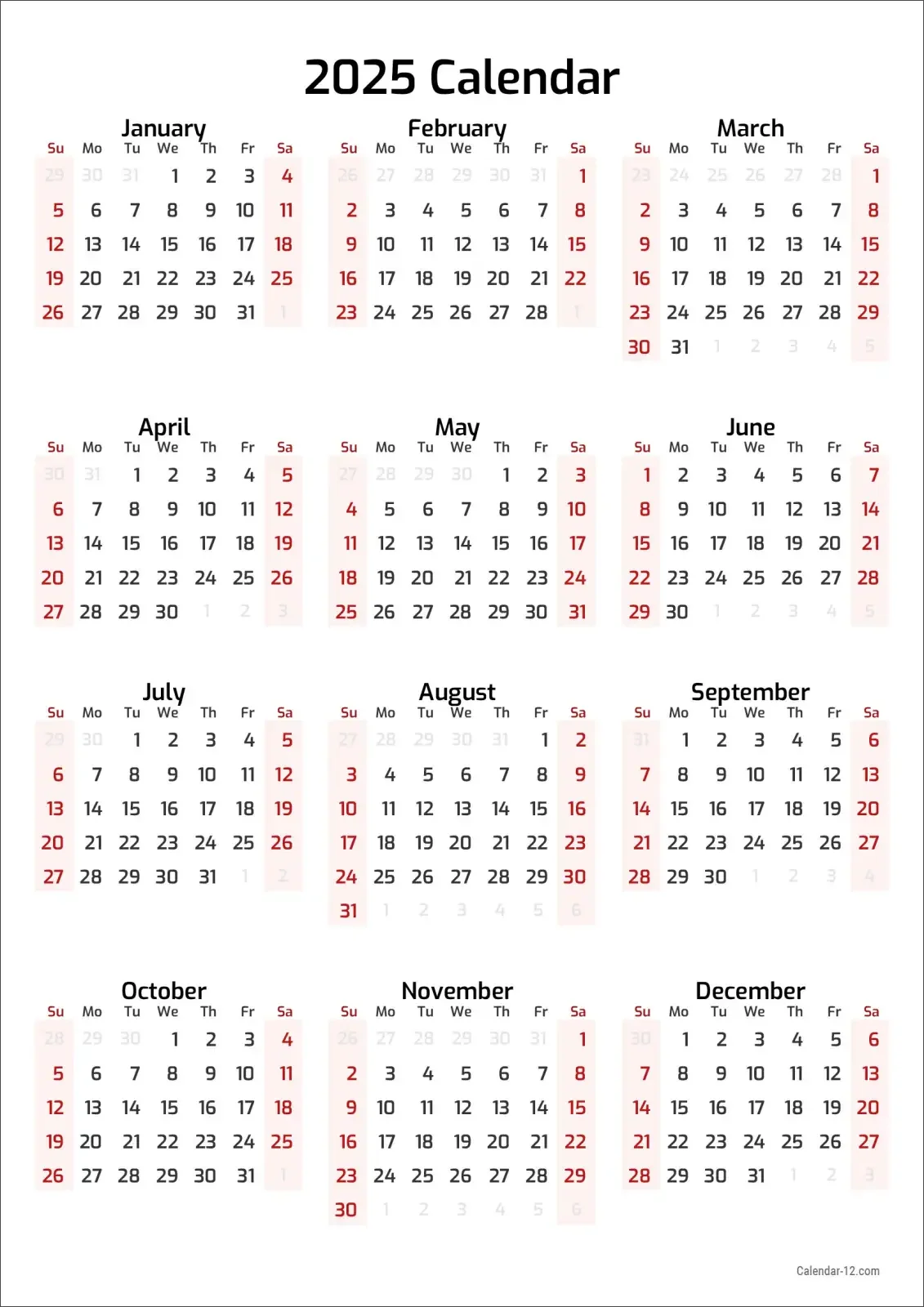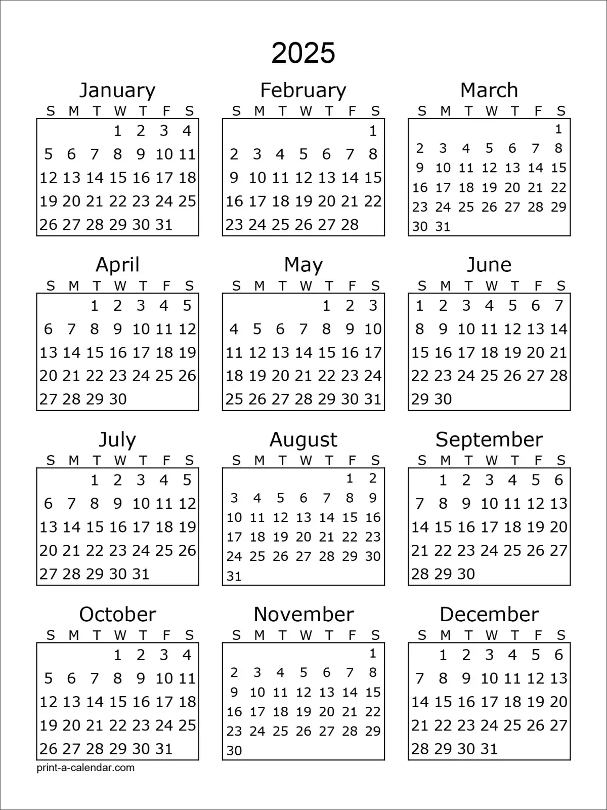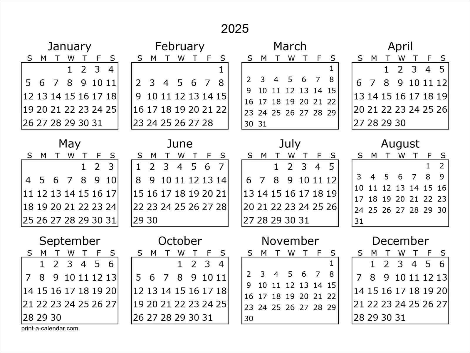 Print a Calendar는 사용자 친화적인 달력 생성 사이트로, 2025년 연간 달력을 한 장으로 A4 사이즈에 맞춰 인쇄할 수 있는 옵션을 제공합니다.