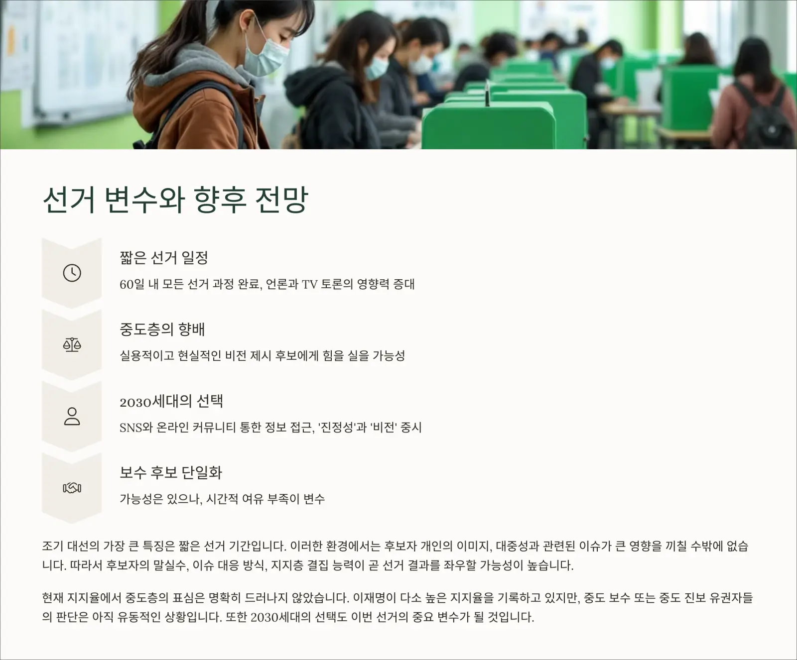 → 조기 대선의 특성상 이미지 중심의 선거로 흐를 가능성이 높습니다.