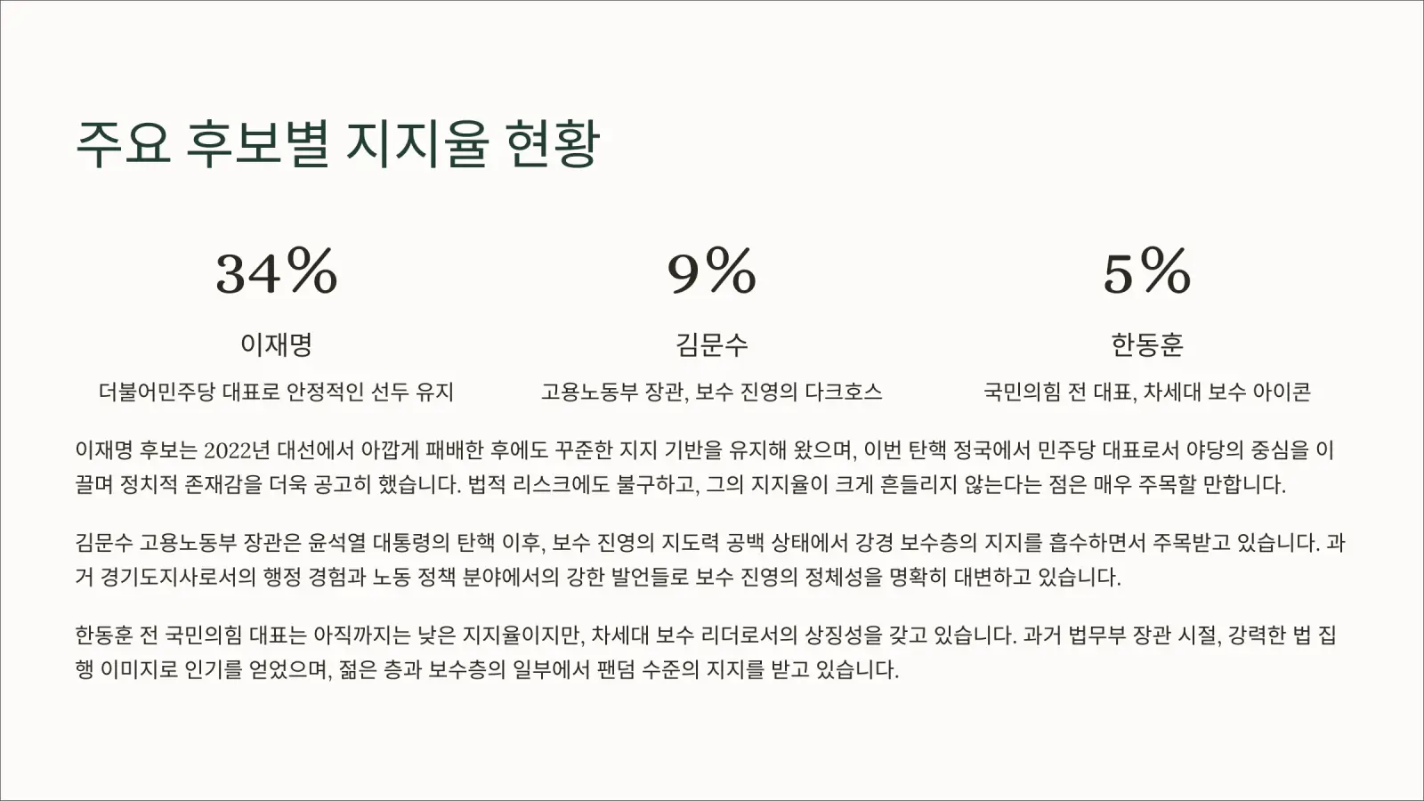→ 여론조사에서는 명확히 드러나지 않았지만, 후보자의 이미지와 메시지가 중요 변수입니다.