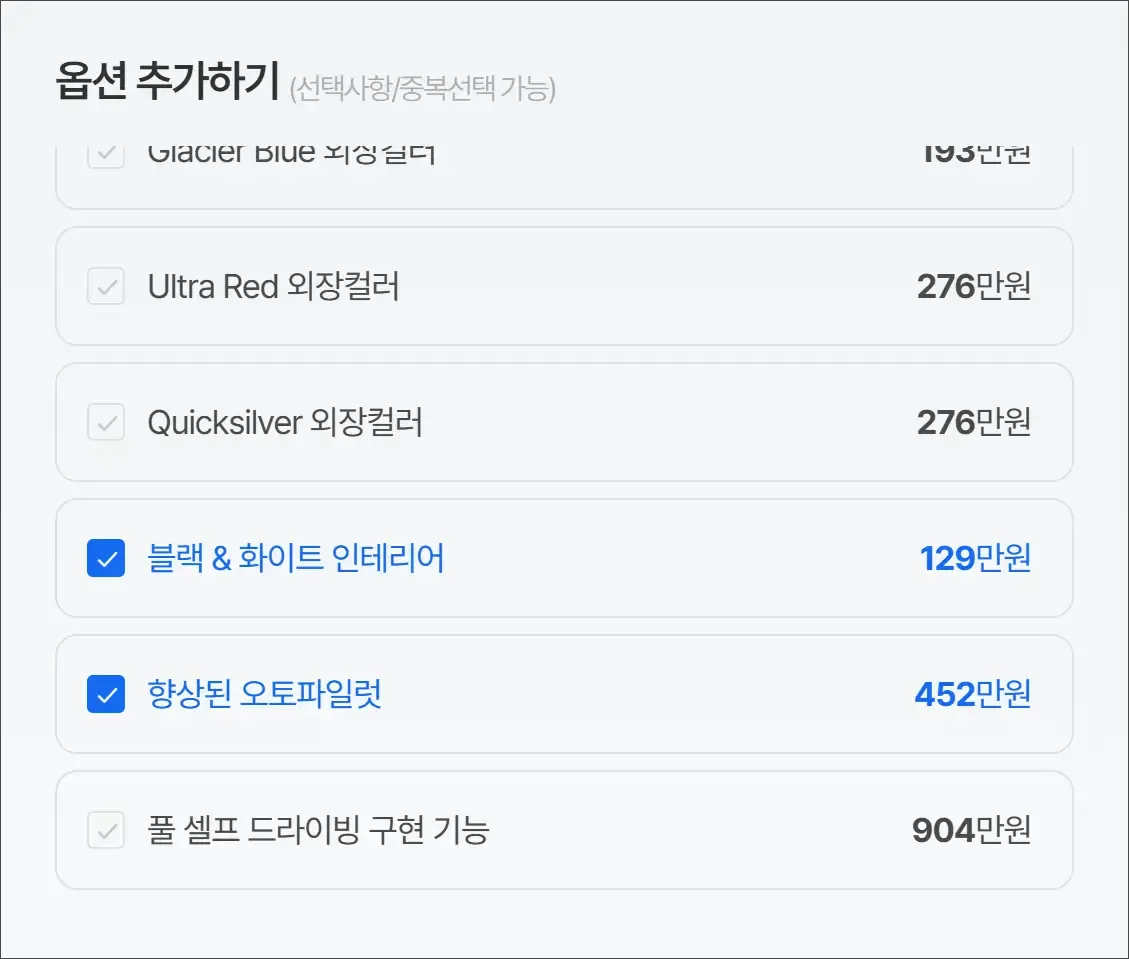 그 다음에 옵션을 선택하는데, 색상과 오토파일럿, 풀 셀프 드라이빌 등을 선택할 수 있습니다.