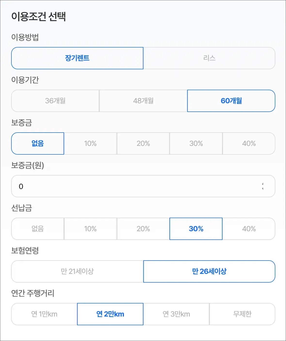 보증금, 선납금 등을 선택할 수 있습니다. 연령과 연간 주행거리 등을 입력합니다.