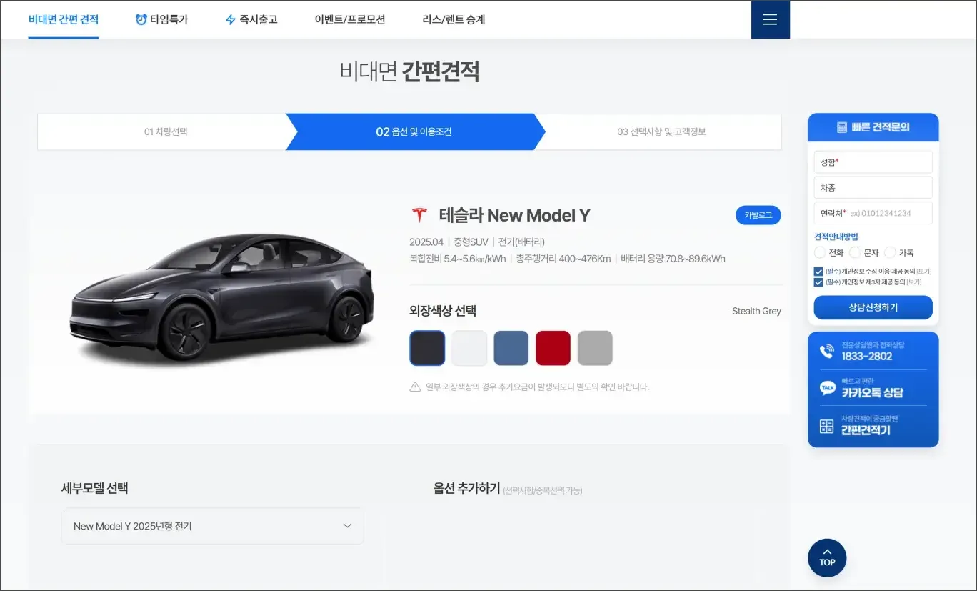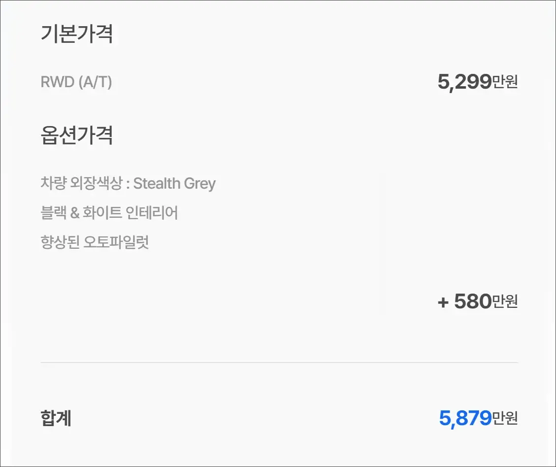 RWD, 스텔스그레이 색상으로 최종 5,879만원 견적이 나왔습니다.