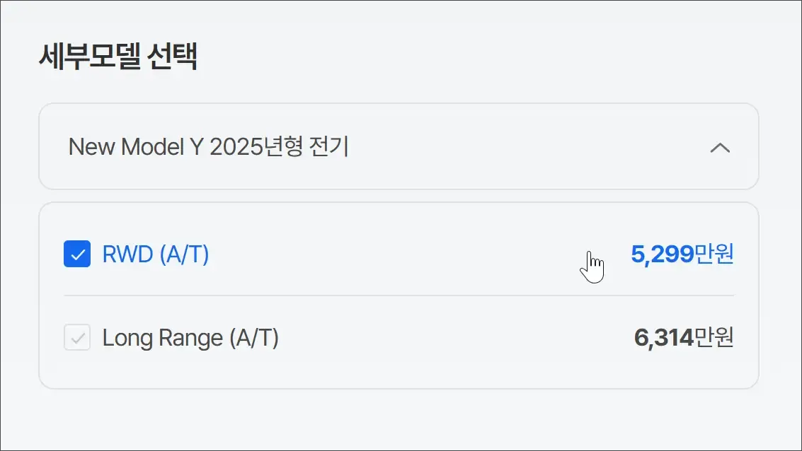 먼저, 세부 모델을 선택합니다. RWD모델은 5,299만원으로 합리적인 가격이라 인기가 많습니다.