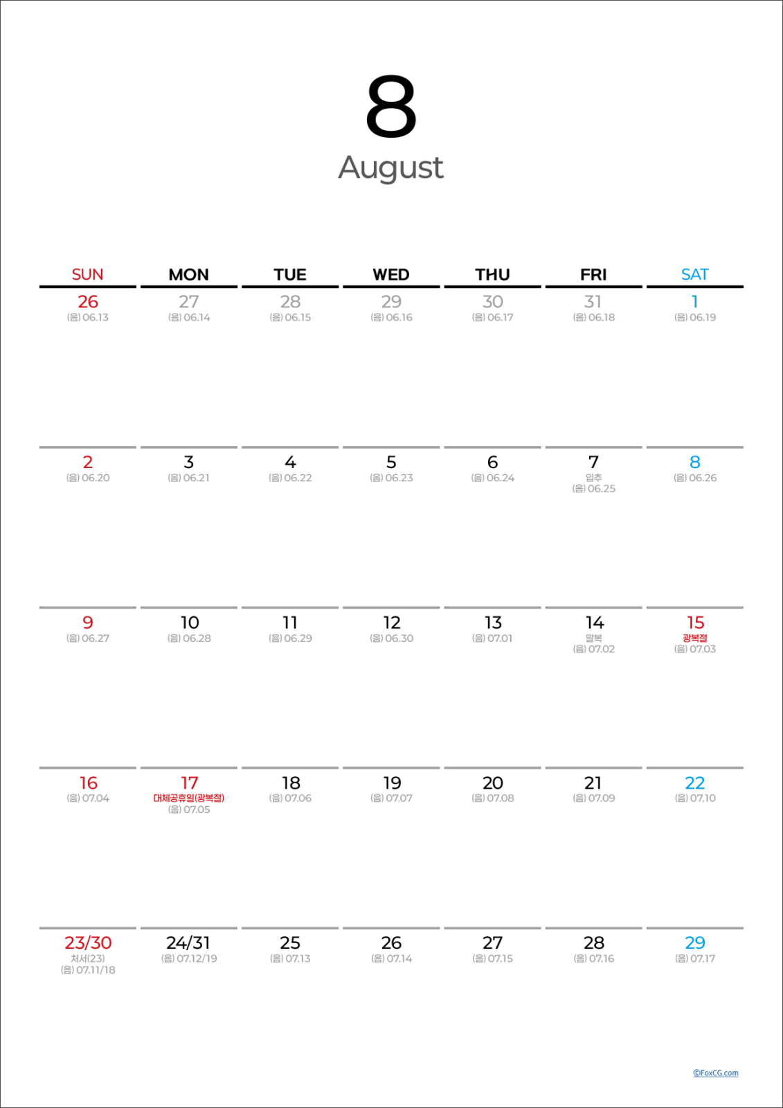 - 8월 15일 (토): 광복절 (8월 17일 월요일 대체 공휴일 지정으로 휴일)
