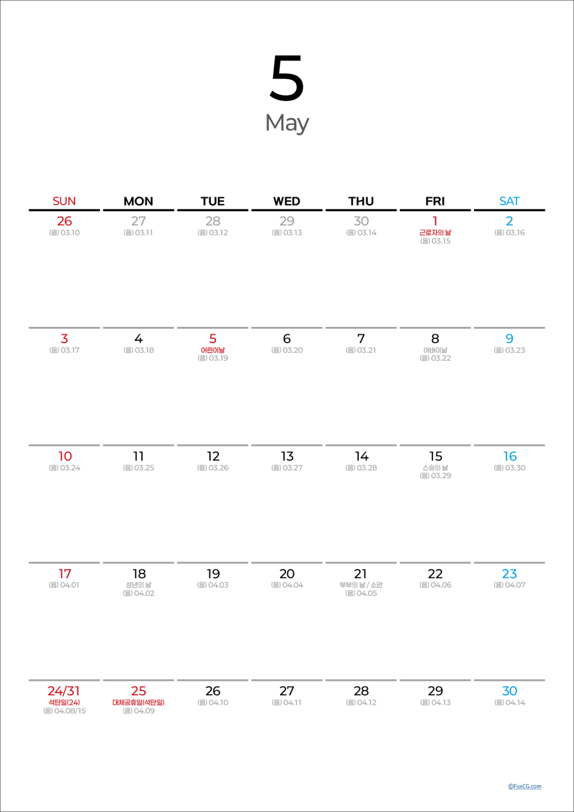 - 5월 24일 (일): 석탄일 (5월 25일 월요일 대체 공휴일 지정으로 휴일)
