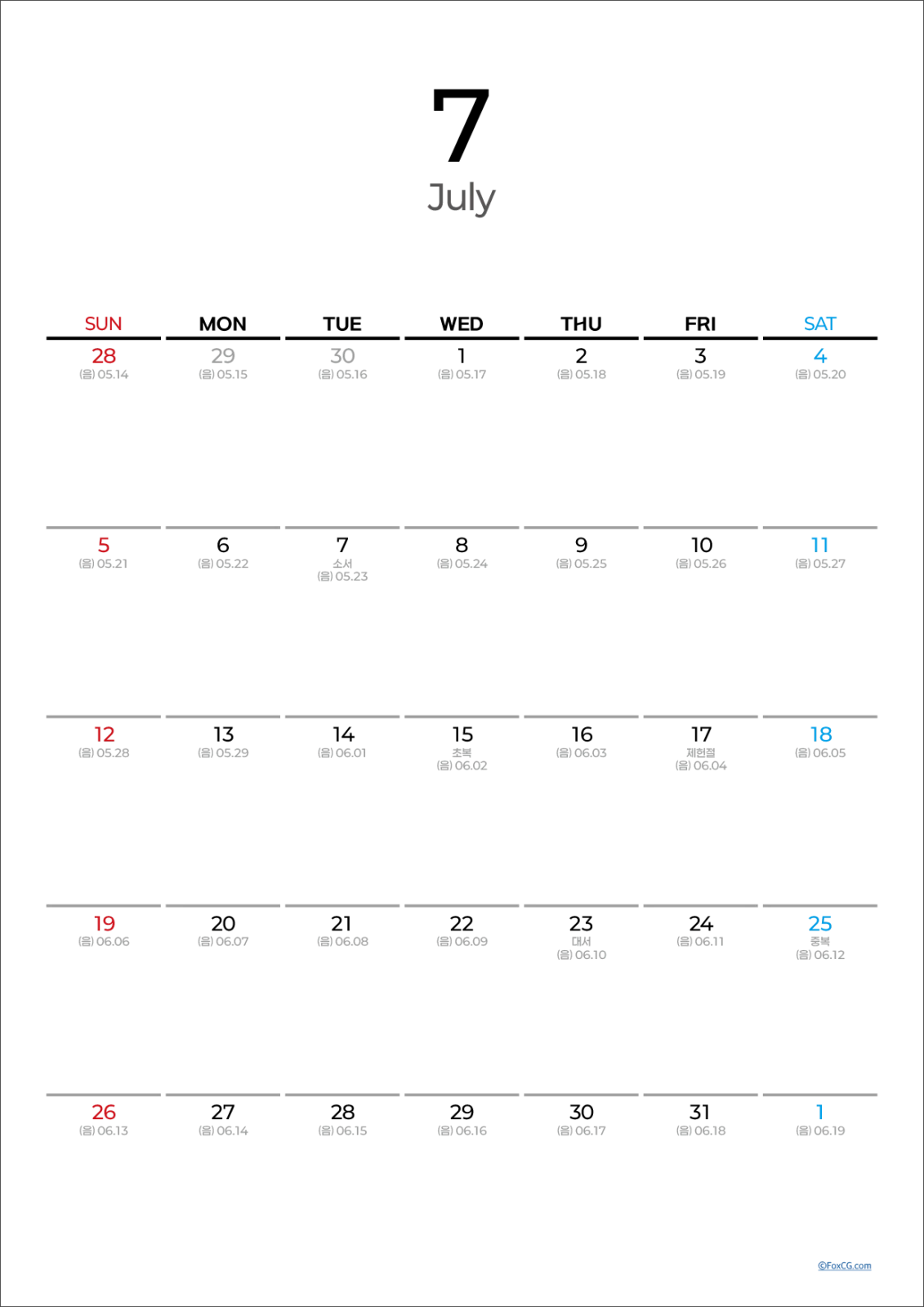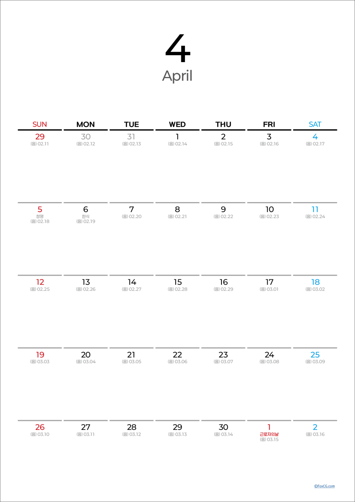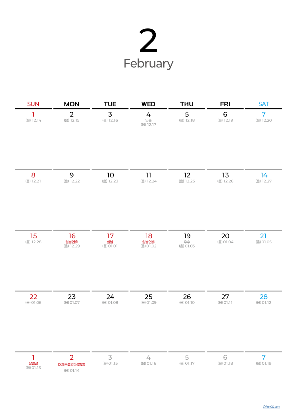 2026년 달력(캘린더) 출력용 PDF/PNG 무료 다운로드 - 음력 표기