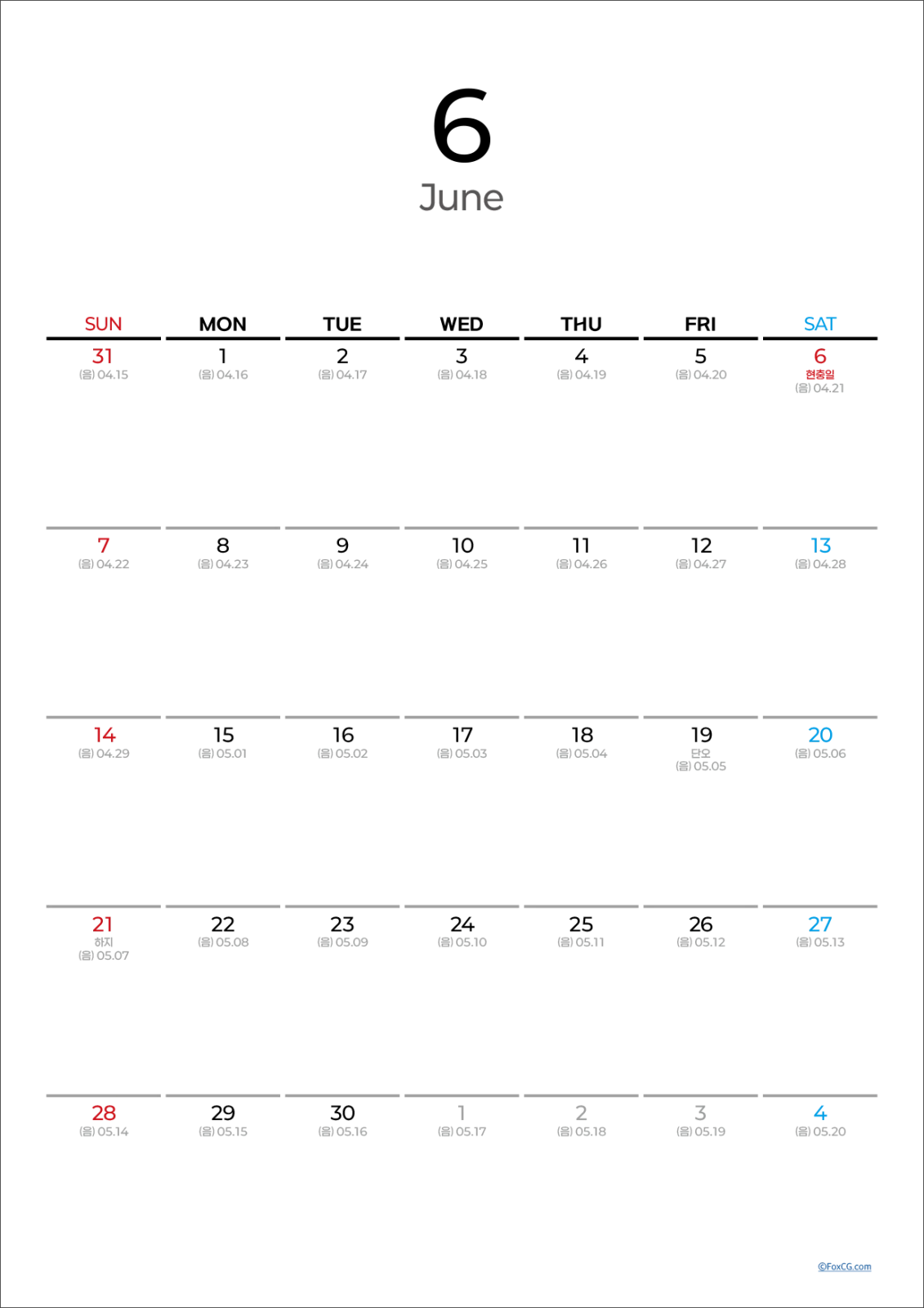 - 6월 6일 (토): 현충일 (토요일 이지만 대체공휴일 적용은 되지 않음)
