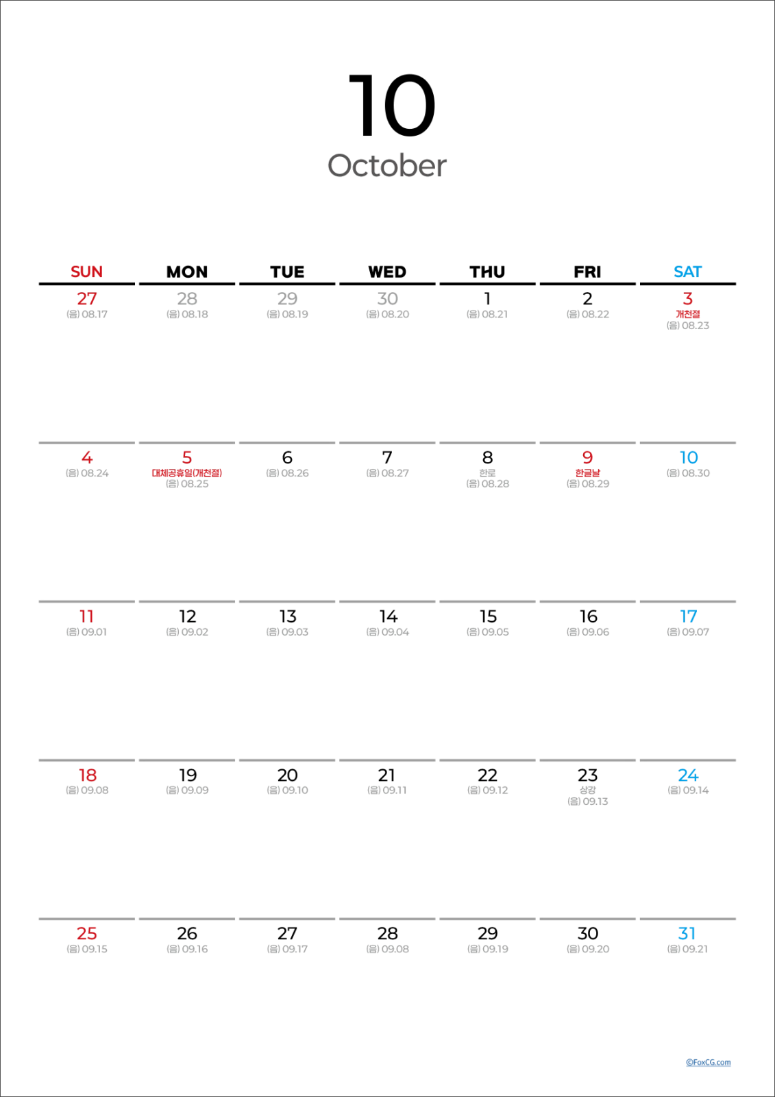 - 10월 3일 (토): 개천절 (10월 5일 월요일 대체 공휴일 지정으로 휴일)