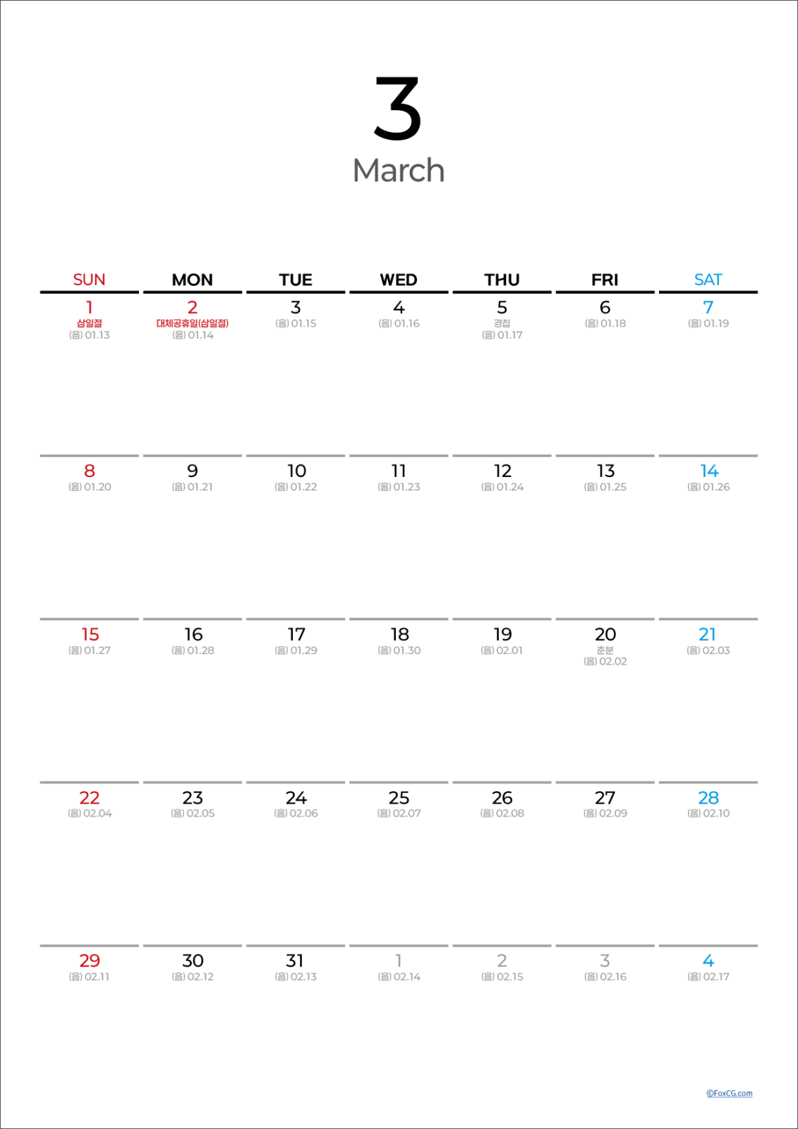 - 3월 1일 (일): 삼일절 (3월 2일 월요일 대체 공휴일 지정으로 휴일)