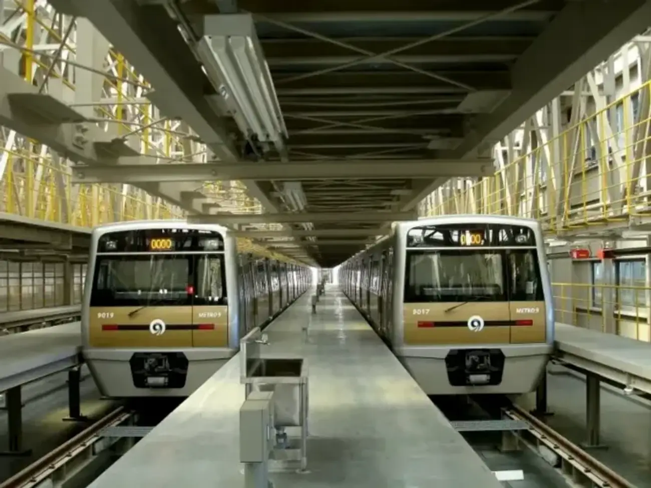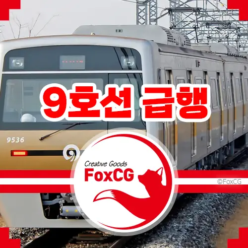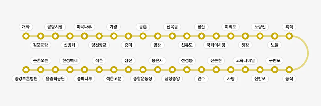9호선은 황금색으로 표시되며, 차량은 한국형 표준 전동차를 개수한 서울시메트로 9호선 9000호대 전동차를 사용하고 있습니다.