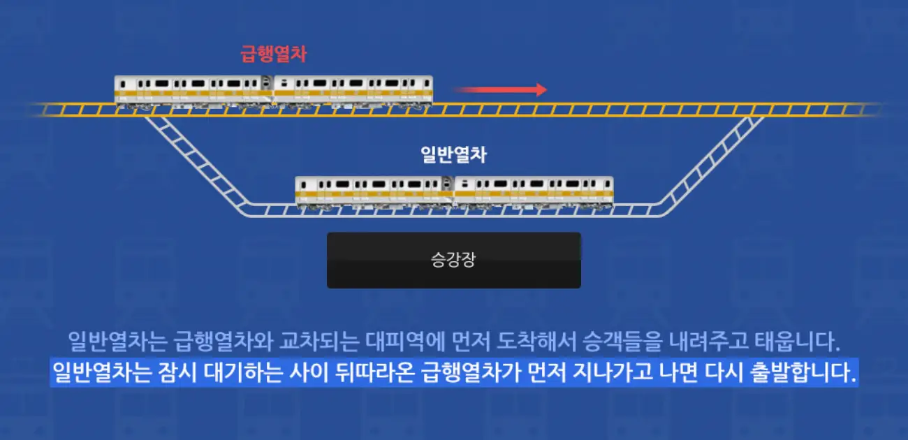 뒤 따라오는 급행열차가 먼저 지나가고, 일반열차는 그 후에 출발하게 됩니다.